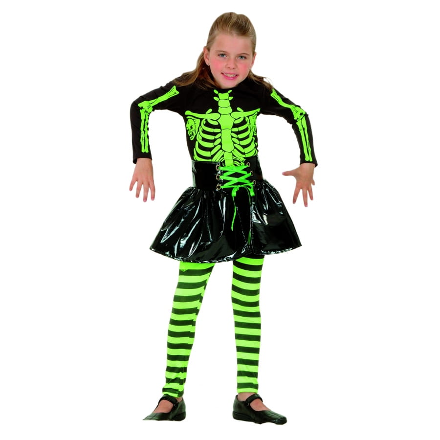 Les petites filles adorent se déguiser et Halloween est l'occasion rêvée pour porter le plus beau des costumes. A la fois original et quelque peu effrayant, le personnage du squelette est fort intéressant pour une soirée de ce genre ! Offrez-lui sans attendre le costume de fillette squelette pour qu'elle s'amuse à faire des scènes de films d'horreur avec ses copines. Elle disposera d'une petite jupe noire accompagnée d'une tunique ornée d'une image de squelette de couleur vert fluo. Un legging vert à rayures est aussi compris dans l'ensemble. La couleur vert fluo a été choisie exprès pour que votre petite princesse brille sur la piste de danse, et pour qu'elle soit la plus remarquable parmi tous les monstres et créatures présents à la soirée. Ce déguisement est proposé en 2 tailles : pour les 7 à 9 ans et pour les 10 à 12 ans.