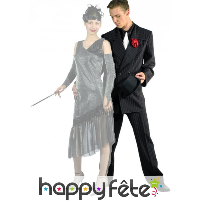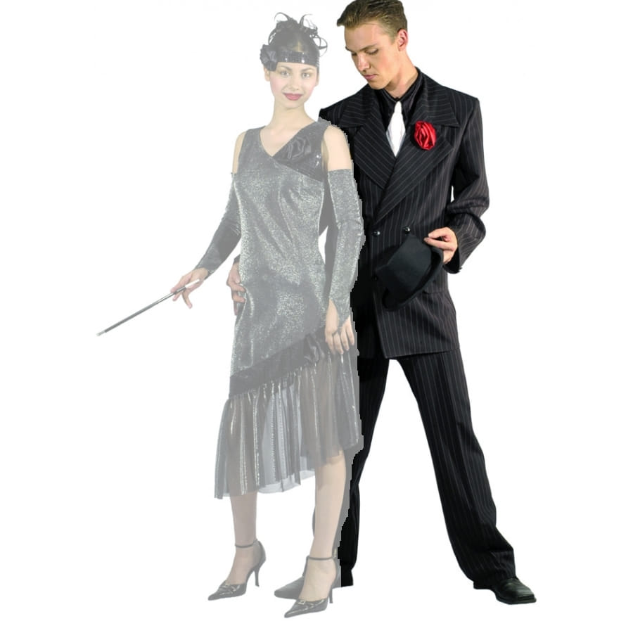 Set de gangster, pour homme, composé d'une veste, d'un pantalon, d'une cravate et d'un plastron. Cet ensemble noir est disponible en taille 50/52 ou 54/56. Il est parfait pour se déguiser en Al Capone lui-même.