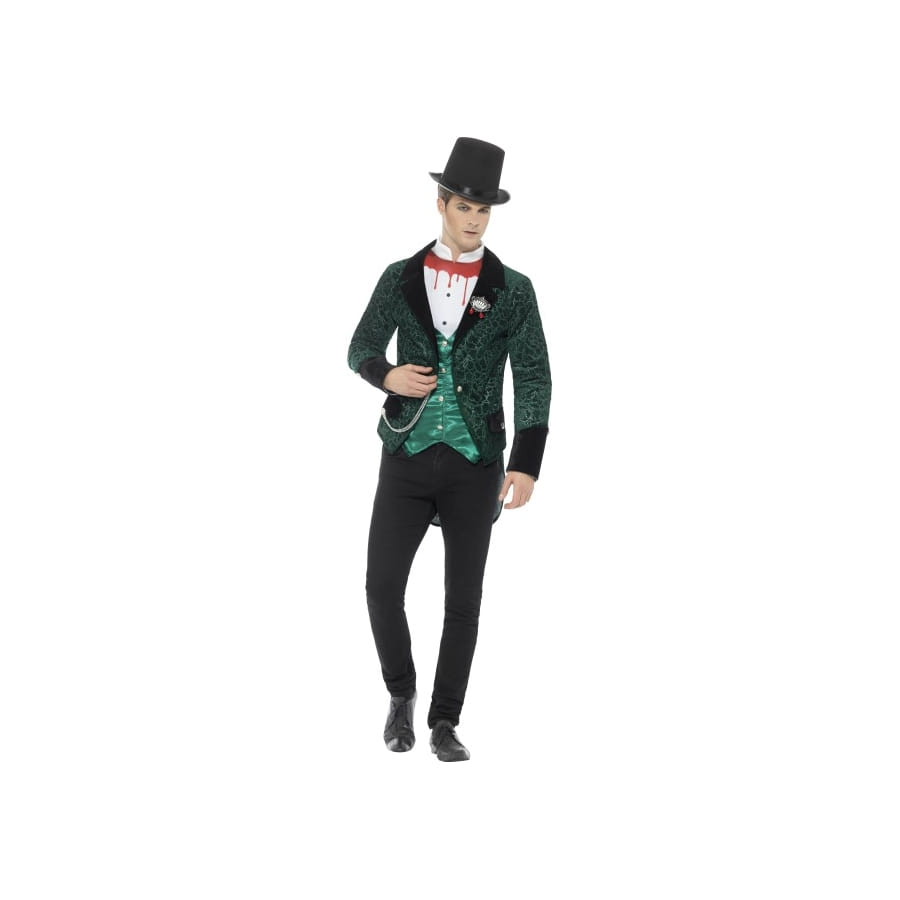 Les monstres suceurs de sang sortent durant halloween, fondez-vous dans le décor avec le costume de gentleman vampire victorien vert. Fabriquée dans un tissu vert foncé, la redingote du costume rehausse le côté gentleman en ramenant à l'époque victorienne. Le col et les manchettes sont de couleur noir. Une broche à épingler sur la veste évoque une image distinguée et classe. A la même veste est rattachée une fausse chemise blanche et un faux gilet satiné vert. Au niveau du col, un écoulement de sang rend l'ensemble plus macabre que jamais. Avec des dents de vampire, mâchoire du haut que vous pouvez retrouver sur Happyfete, vous serez tout simplement parfait dans le rôle gentleman vampire victorien.