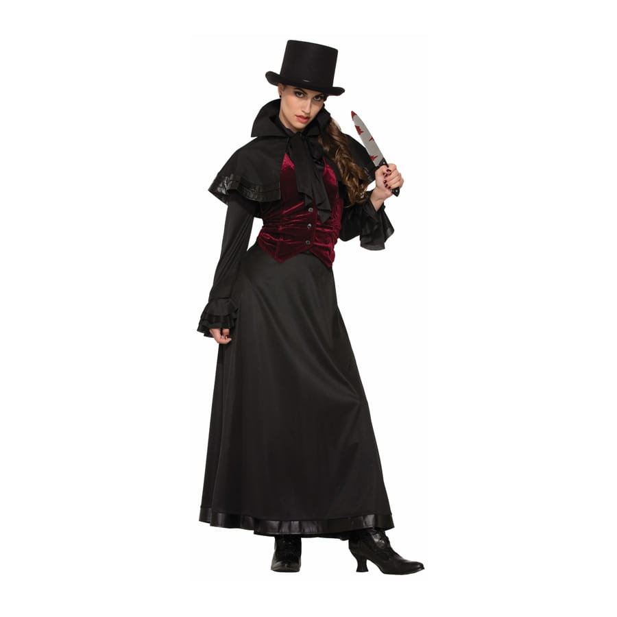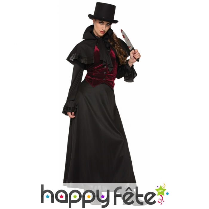 Si vous avez adoré cet effrayant personnage au cinéma, alors pourquoi ne pas vous mettre dans sa peau le temps d'une soirée, même en étant du sexe opposé. Happyfête propose un déguisement de Jack l'éventreur pour femme composé d'une jupe longue noire, d'un haut avec veston et noeud attachés, ainsi que d'une cape. La matière du gilet grenat est en velours et sera très facile à enfiler. Le noeud en boucle habillera votre cou élégamment tandis que la cape tombera le long de votre dos. Vous pouvez vous procurer le chapeau haut de forme et le couteau sur notre site pour compléter le costume.