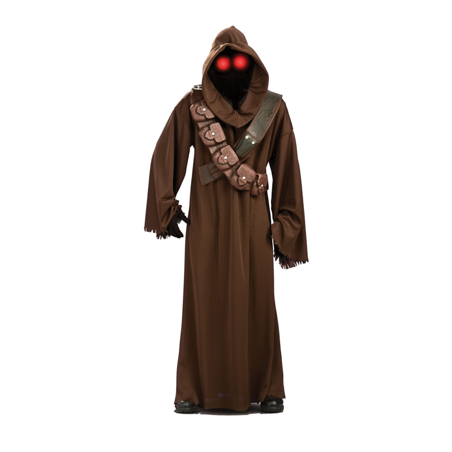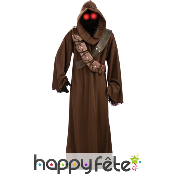 Terrifiant et efficace, ce costume de Jawa, star wars luxe est dédié aux plus audacieux d'entre vous. Il comprend une longue robe marron avec capuche, une cagoule et un ceinturon. La robe a des manches longues et amples avec des bases à effet déchiré. Le ceinturon est agrémenté de plusieurs poches et adopte une belle imitation cuir marron. La cagoule possède des yeux lumineux rouges qui viennent compléter l'ensemble et lui procurent un grand réalisme. Ce déguisement est sous licence officielle Star Wars et conçu pour adulte. Il en fera fuir plus d'un lors du soir du 31 Octobre et effrayera les plus costauds.