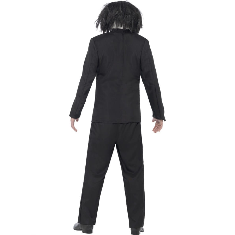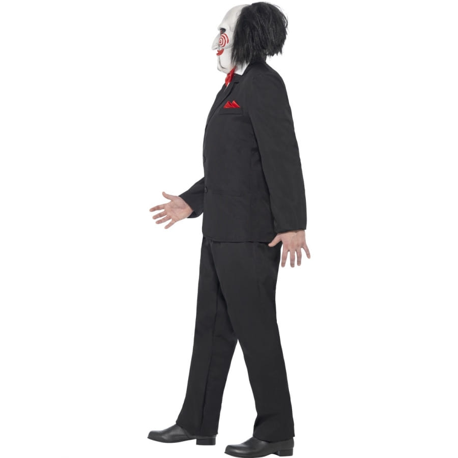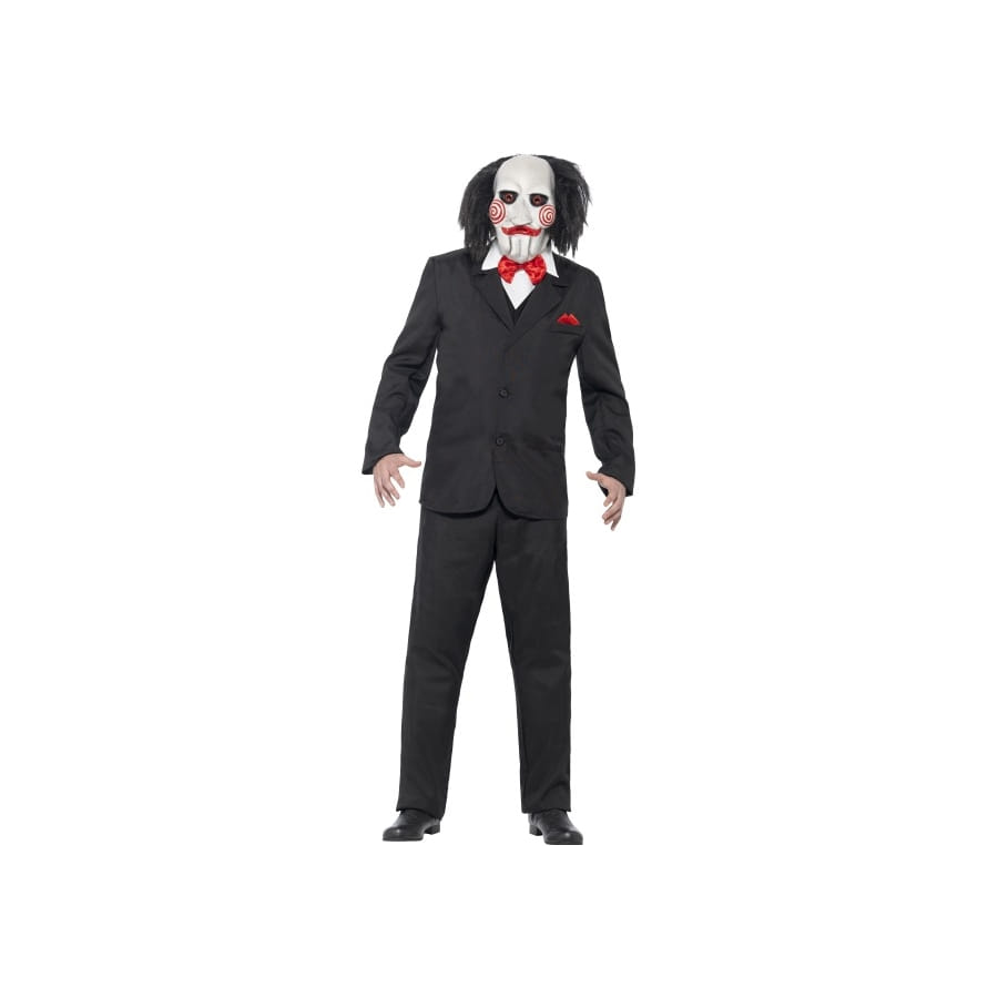 Le célèbre tueur au puzzle Jigsaw est un remarquable personnage du cinéma. Le costume de couleur est composé d'une veste, d'un faux gilet, d'une chemise blanche avec un noeud rouge et bien sûre d'un masque avec les longs cheveux, comme dans Saw. C'est un déguisement pour adulte de taille M correspondant à une taille de poitrine 96-101 cm et entrejambe 83 cm. Aussi original qu'il soit, ce costume de Jigsaw est un modèle de couleur noire. Le nettoyage est sec est conseillé pour l'entretient du déguisement.