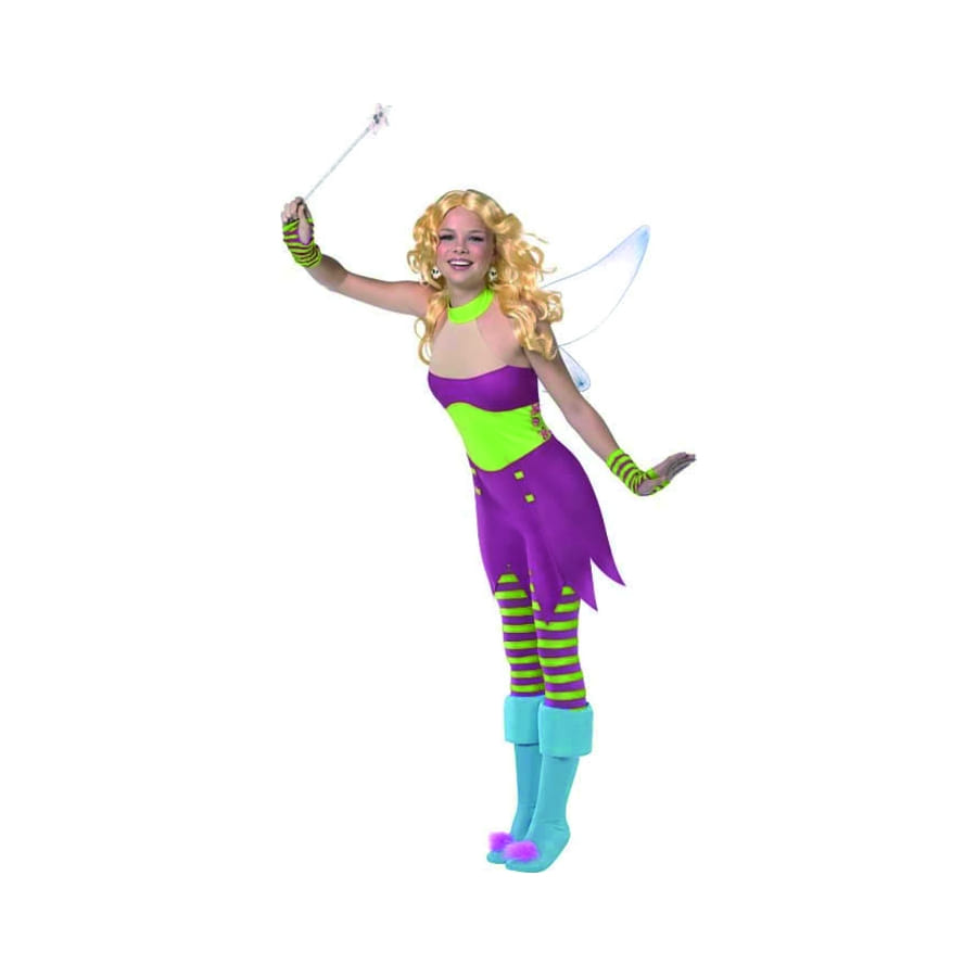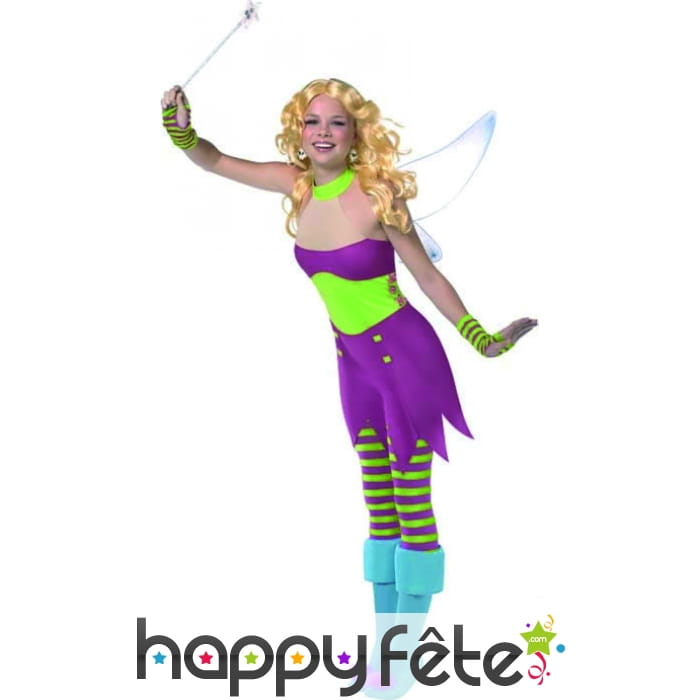 Vous serez une jolie fée avec cette robe vert et prune avec collants, ailes et gants assortis et des surbottes bleues avec pompons roses. Cet ensemble est disponible en taille 32 ou 34. Il est idéal pour se transformer en Fée Clochette.