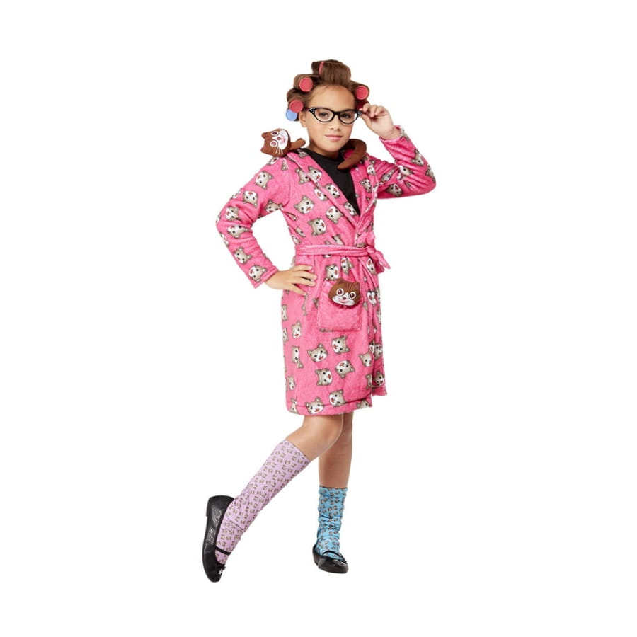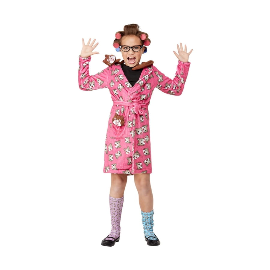 Ce costume inclut un peignoir, des chaussettes et une paire de lunettes.