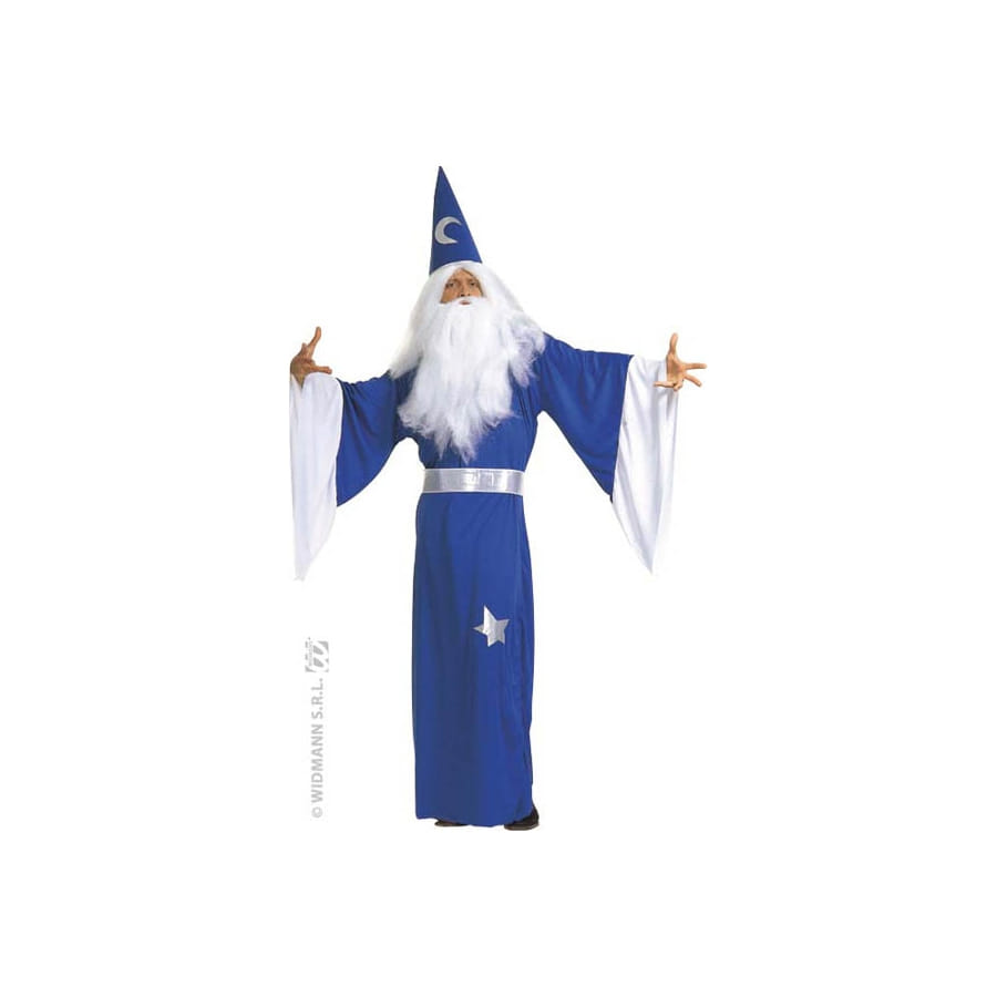 Set de déguisement de sorcier, pour homme, composé d'une robe, d'une ceinture et d'un chapeau. Cet ensemble argenté, blanc et bleu est disponible en taille L, M ou S. Il est parfait pour un déguisement inspiré de la magie et de la sorcellerie.