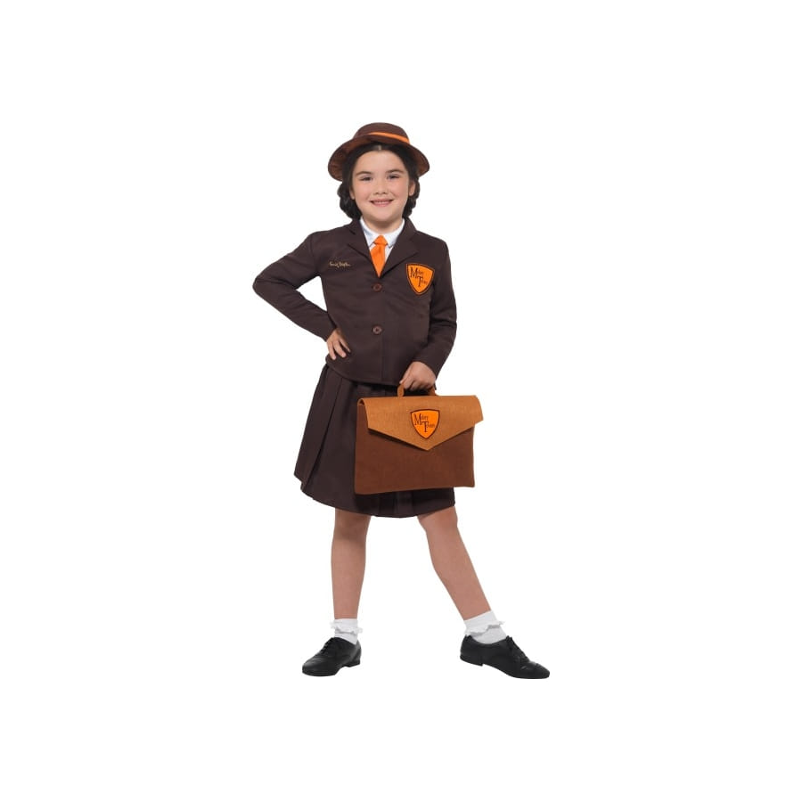 Emmenez votre fillette dans l'univers palpitant d'Enid Blyton avec ce costume de Malory School pour enfant. Elle sera transformée en une écolière tendance british. L'ensemble de la tenue est en marron. Elle se compose d'une veste à manches longues, fermée par 2 boutons sur le devant et ornée de l'insigne "Mallory School" sur le côté gauche, dans une légère touche orangée. Un faux chemisier de couleur blanche se portera à l'intérieur de la veste, c'est-à-dire qu'il s'agit juste d'un faux col, agrémenté d'une fausse cravate orange, en accord avec la couleur de l'insigne de l'école. Pour le bas, vous aurez une jupe évasée marron. L'ensemble sera complété par un chapeau marron orné d'un ruban orange, ainsi que d'une petite serviette floquée Mallory School. Ce costume sera parfait pour une fête à thème Uniformes ou un petit tour outre-Manche.