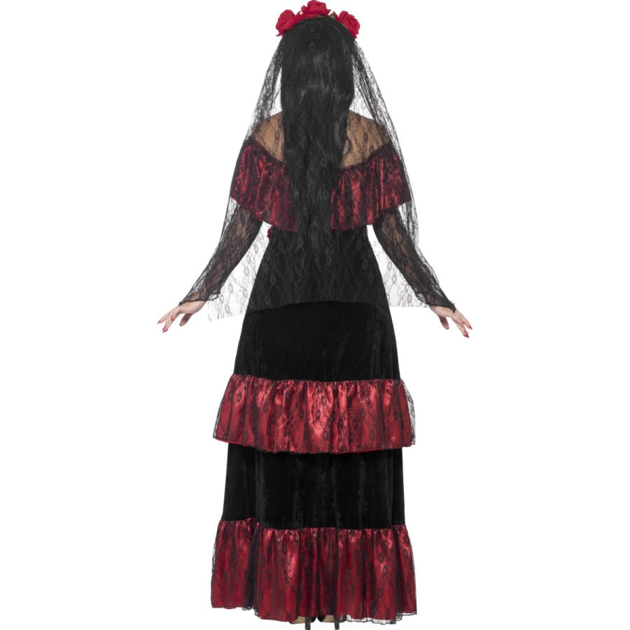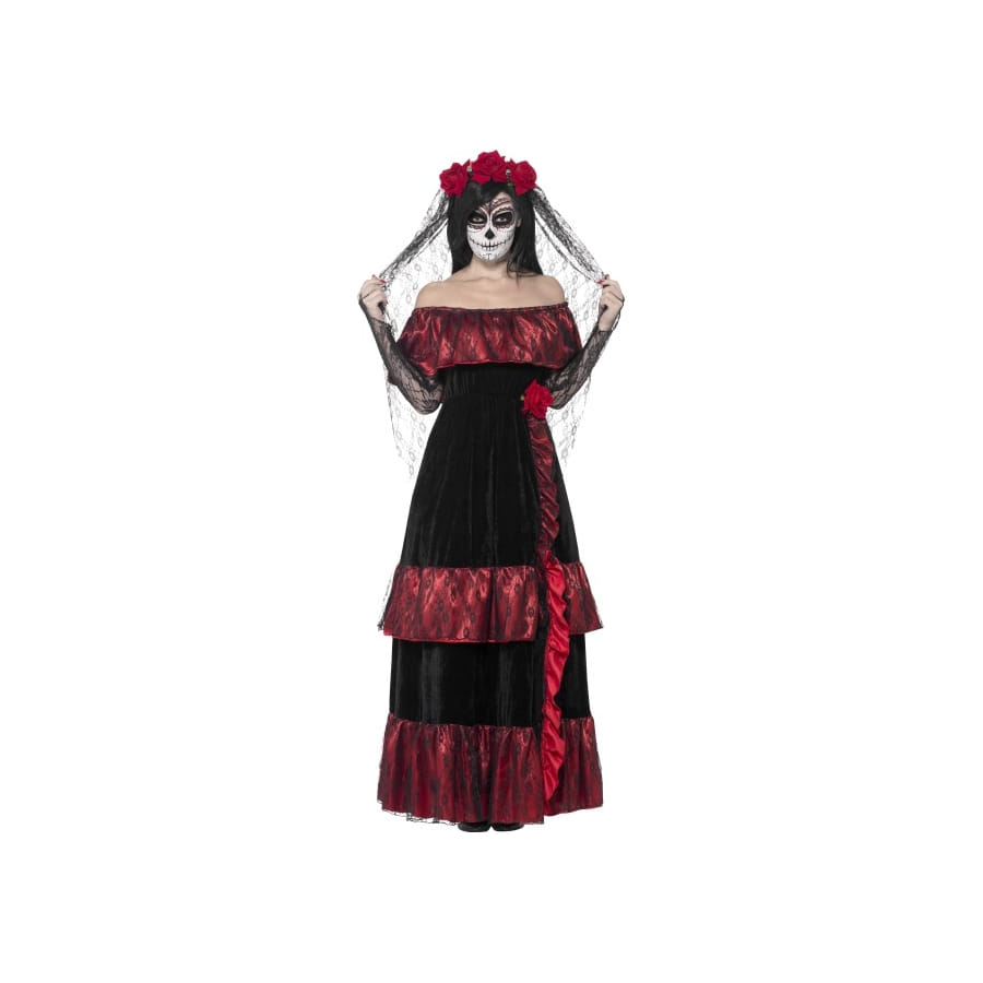 Nous vous proposons ce costume de mariée du jour des morts. La mariée que vous allez représenter portera une longue robe à volants de couleur noire et rouge ornée d'une rose rouge ainsi qu'un voile noir paré de nombreuses roses rouges. De plus, nous vous proposons 3 tailles pour ce même déguisement pour femme: L, M, S et XL.Ce sera l'un des meilleurs déguisements que vous aurez porté de toute votre vie, faites-nous confiance pour cela.