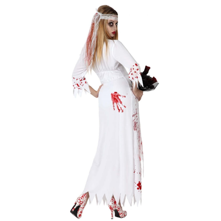 De couleur blanche, la longue robe immaculée de faux sang présente une découpe boiseau au niveau du bas et sur les extrémités des manches.