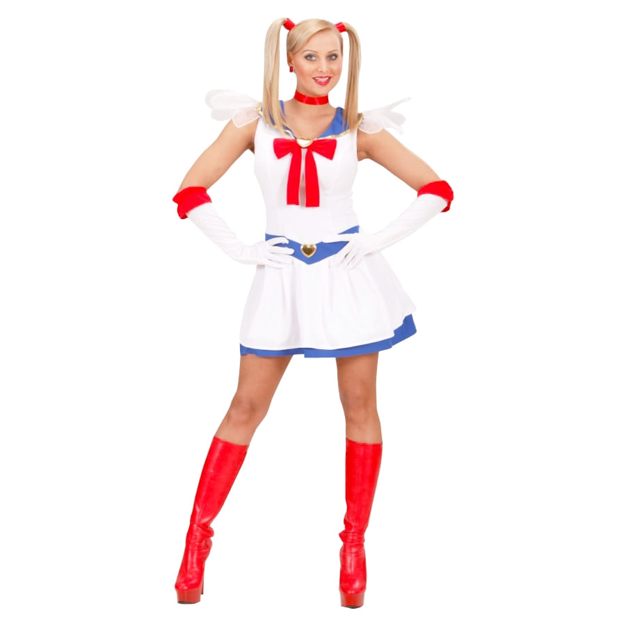 Set de déguisement manga, pour femme, composé d'une robe, d'une paire de gants et d'un serre-cou. Cet ensemble blanc, bleu et rouge est disponible en taille S, M ou L. Il est parfait pour se déguiser en "Sailor Moon" ou autre guerrière manga.