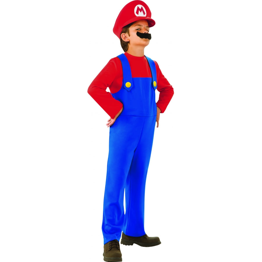 Set de déguisement de Mario sous licence, composé d'une casquette, d'une moustache et d'une combinaison bleu et rouge. Cet ensemble est disponible en tailles L et M et est idéal pour un enfant entre 8 et 10 ans. Il est parfait pour un carnaval ou un anniversaire.