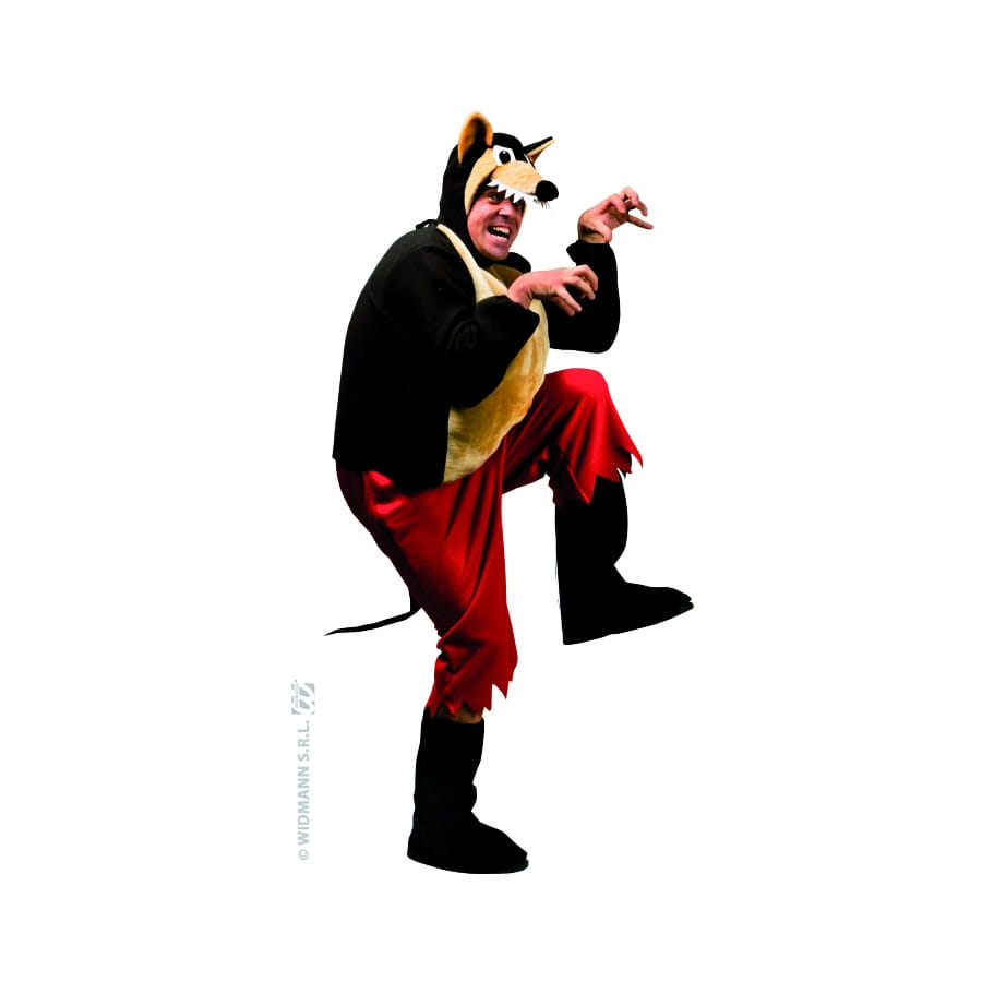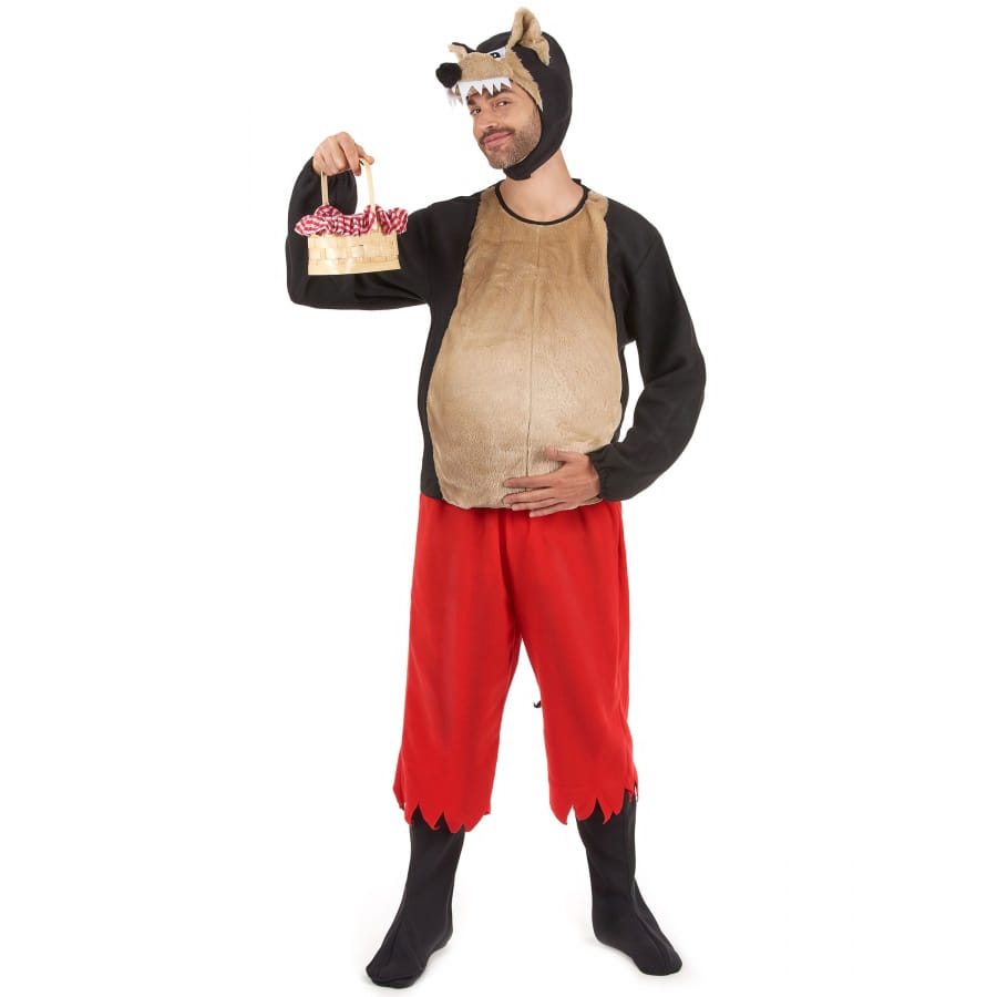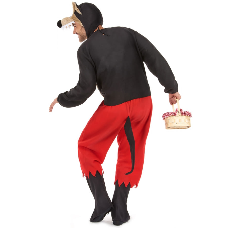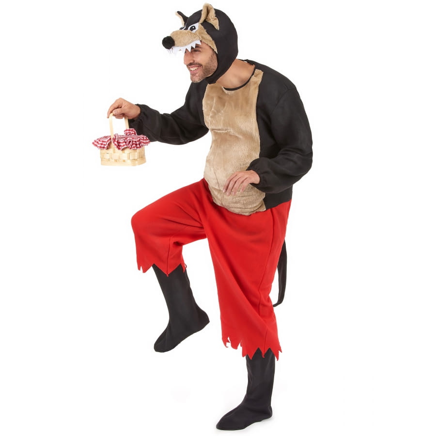 Déguisement de conte de fée, pour homme, composé d'une tunique, d'un pantalon et d'une coiffe de couleur beige, noire et rouge. Cet ensemble est parfait pour se transformer en Grand Méchant Loup, très réputé dans les contes de fées.