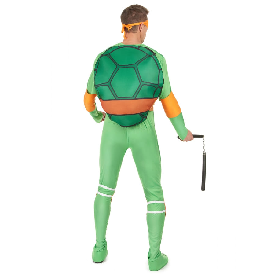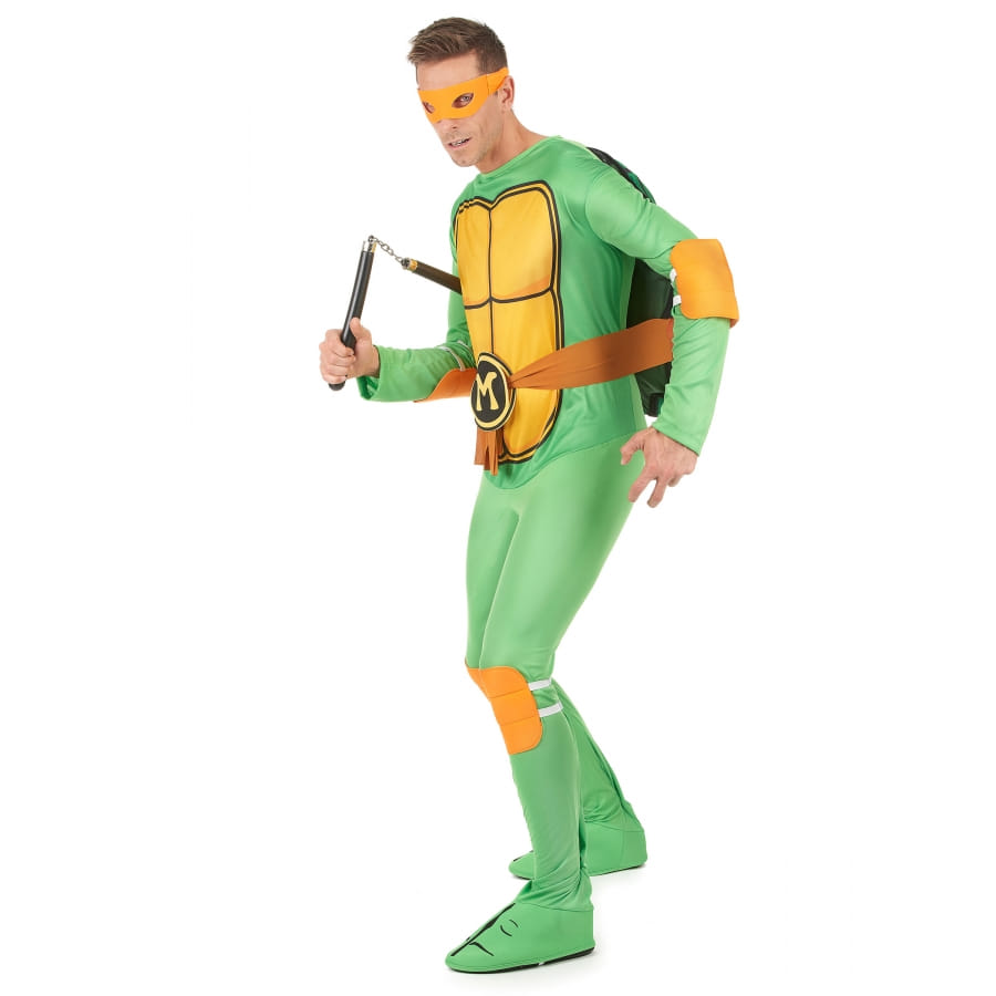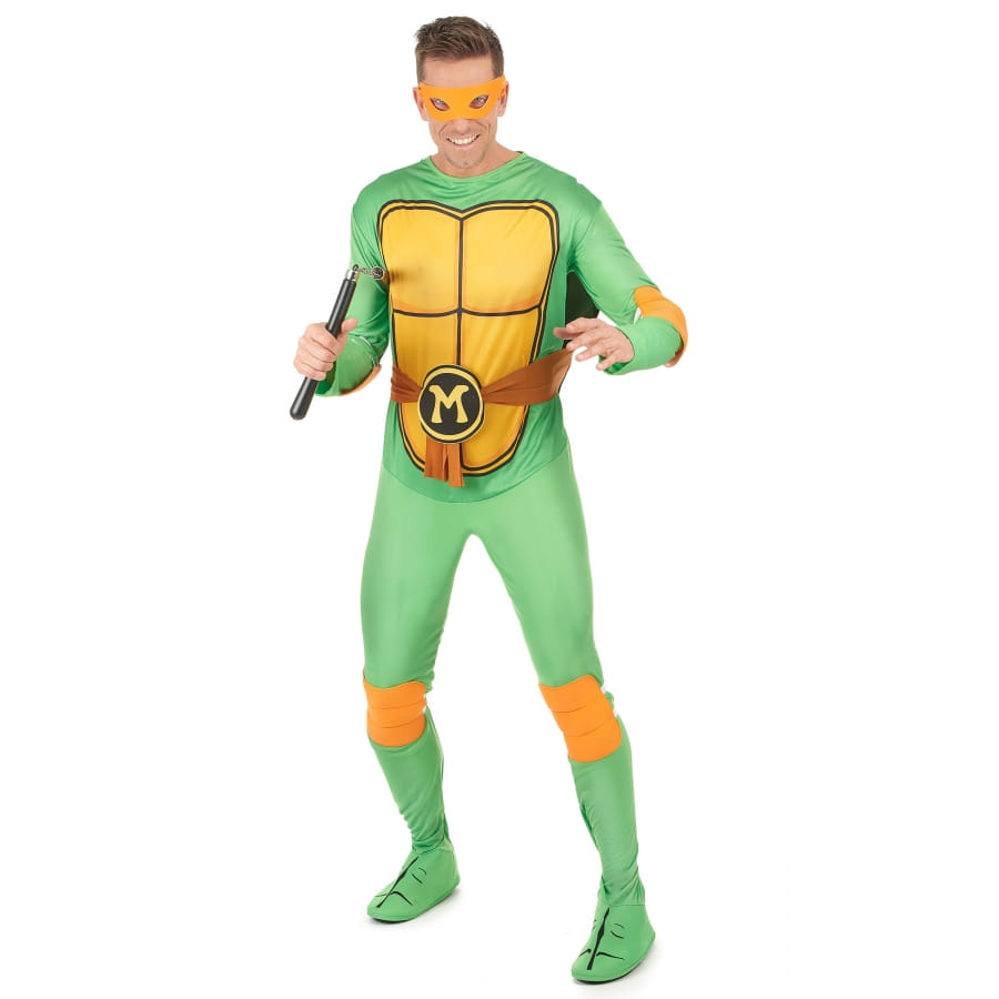 Nous vous proposons ce costume de Michelangelo pour adulte pour que vous puissiez jouer le rôle du plus drôle des quatre Tortues Ninja ! Celui-ci est constitué par une combinaison imprimée et un masque loup. La combinaison est de couleur verte, avec une carapace jaune imprimée sur le buste. Une ceinture marron vient s'y attacher pour y donner plus de réalisme. Cette combinaison possède des manches longues et couvre jusqu'au-dessus des pieds. Le loup orange, l'accessoire indispensable, vient finaliser ce déguisement. Ce dernier est sous licence officielle Tortues Ninja et convient aux hommes. Rien de tel qu'un déguisement de Michelangelo pour faire la fête et manger de délicieuses pizzas !