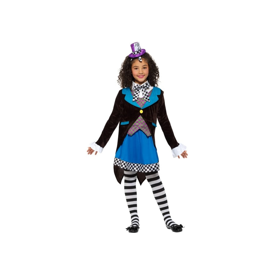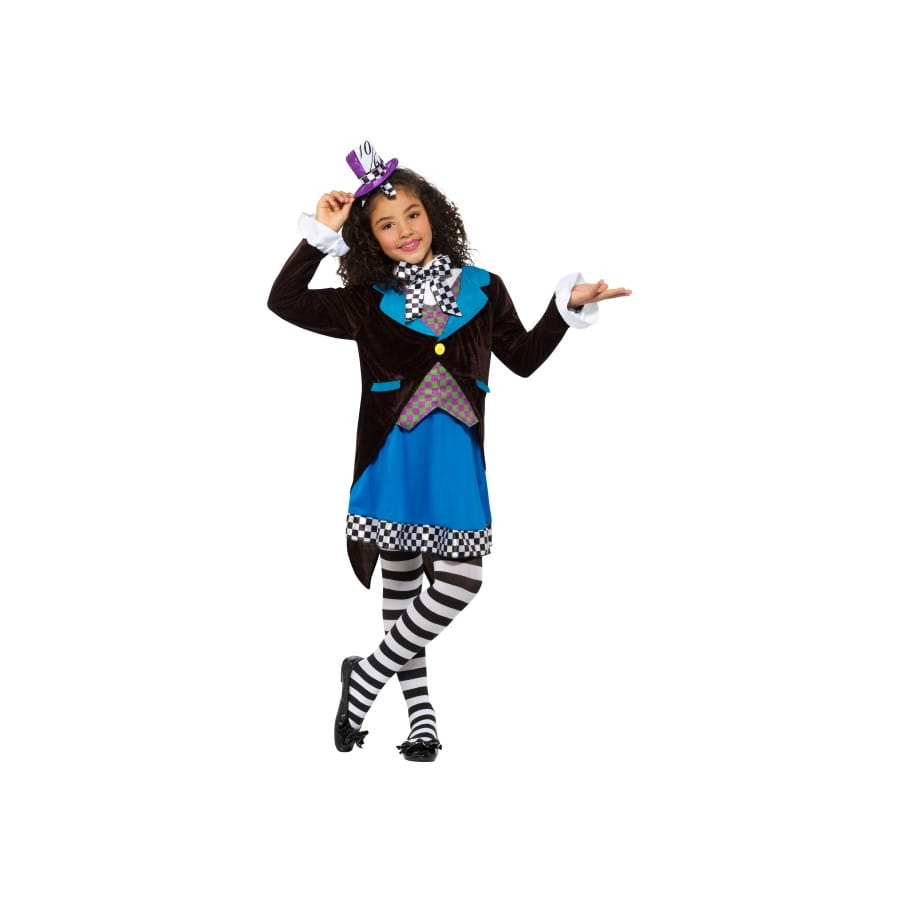 C'est l'heure du thé ! Le rôle du Chapelier fou peut être interprété par une petite fille. La preuve avec ce costume de Miss Hatter pour fillette. Une jeune demoiselle pourra incarner ce personnage insolite dans une superbe robe bleue avec des bords en damier. Un gilet a été cousu au vêtement et l'extérieur est formé par une longue veste noire à manches longues qui se referme à l'aide d'un unique bouton sur le devant. Un noeud noir et blanc à motifs damier accompagne la robe. Et enfin, la petite Miss Hatter sera coiffée à l'aide d'un mini chapeau haut de forme de couleur violet, noir et blanc.