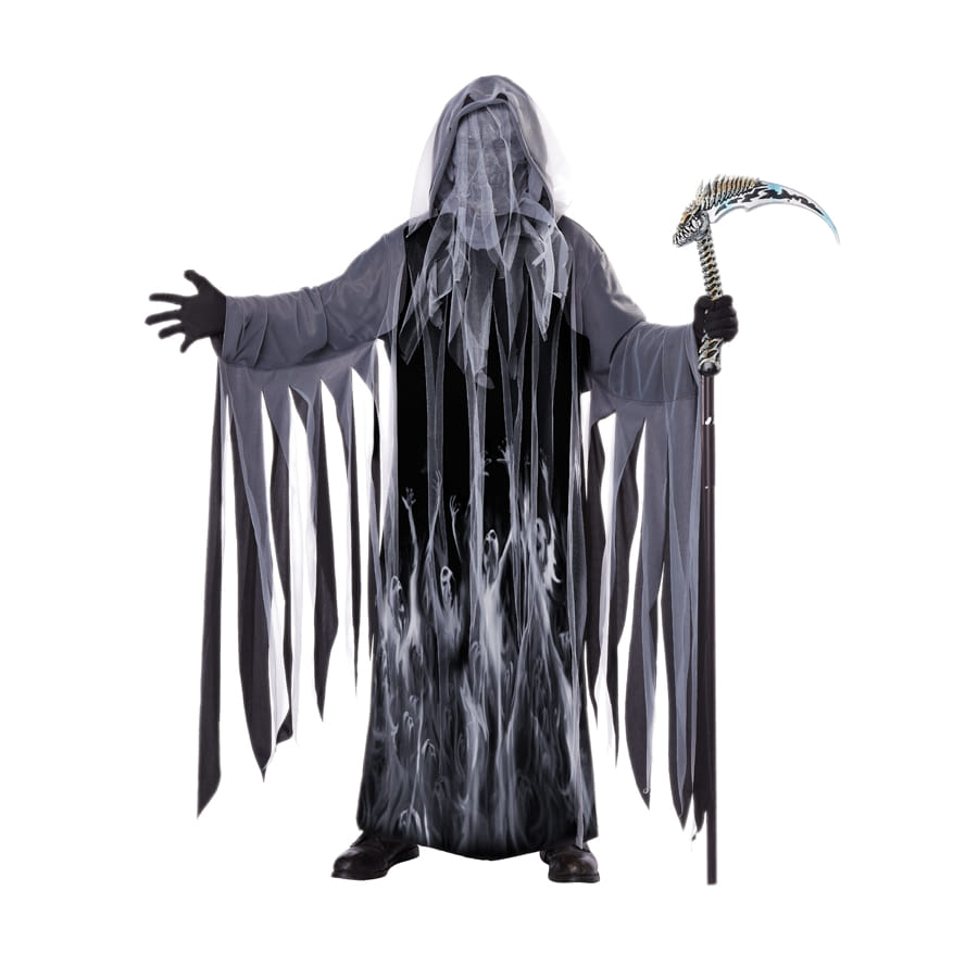 C'est bien plus qu'un simple monstre ! Nous vous procurons ce déguisement de moissonneur d'âme, l'un des plus horrifiants de nos déguisements. Il se compose d'une robe longue noire à capuche, à manches longues, ornée par des lambeaux de tissu gris au niveau du visage pour le cacher. Le bas de la robe est imprimé de plusieurs fantômes et les manches sont agrémentées de longues franges de manière à représenter un effet déchiré. Un masque terrifiant représentant un visage monstrueux est aussi inclus dans l'ensemble afin de le compléter. Ce déguisement est fait pour les hommes de tailles : L/XL/S/M. Si vous arborez ce déguisement le soir d'Halloween, une chose est sûre, vous deviendrez le maître de l'épouvante. Il ne vous restera plus qu'à vous munir d'une faux pour agrémenter votre déguisement, nous en avons quelques-unes dans notre stock d'accessoires.
