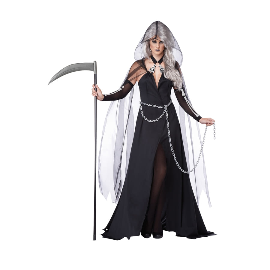 Soyez à la fois la femme la plus dangereuse et la plus sexy lors de la soirée Halloween ou le temps d'une soirée Horreur avec ce costume de Femme Faucheuse qui ne manquera pas de faire sensation. Il se compose d'une longue robe noire évasée et uni-jambière attachée au cou, d'une capuche en voile gris avec cape assortie, de manchons noirs imprimés d'os, et d'une longue chaîne argentée. Bien entendu, ce costume est dédié à la gente féminine (adulte), de tailles : L/ M/ S/ XS. Vous trouverez également sur notre site une faux, qui apportera une touche finale à votre déguisement. Tout cela réuni, vous en ferez trembler plus d'un.
