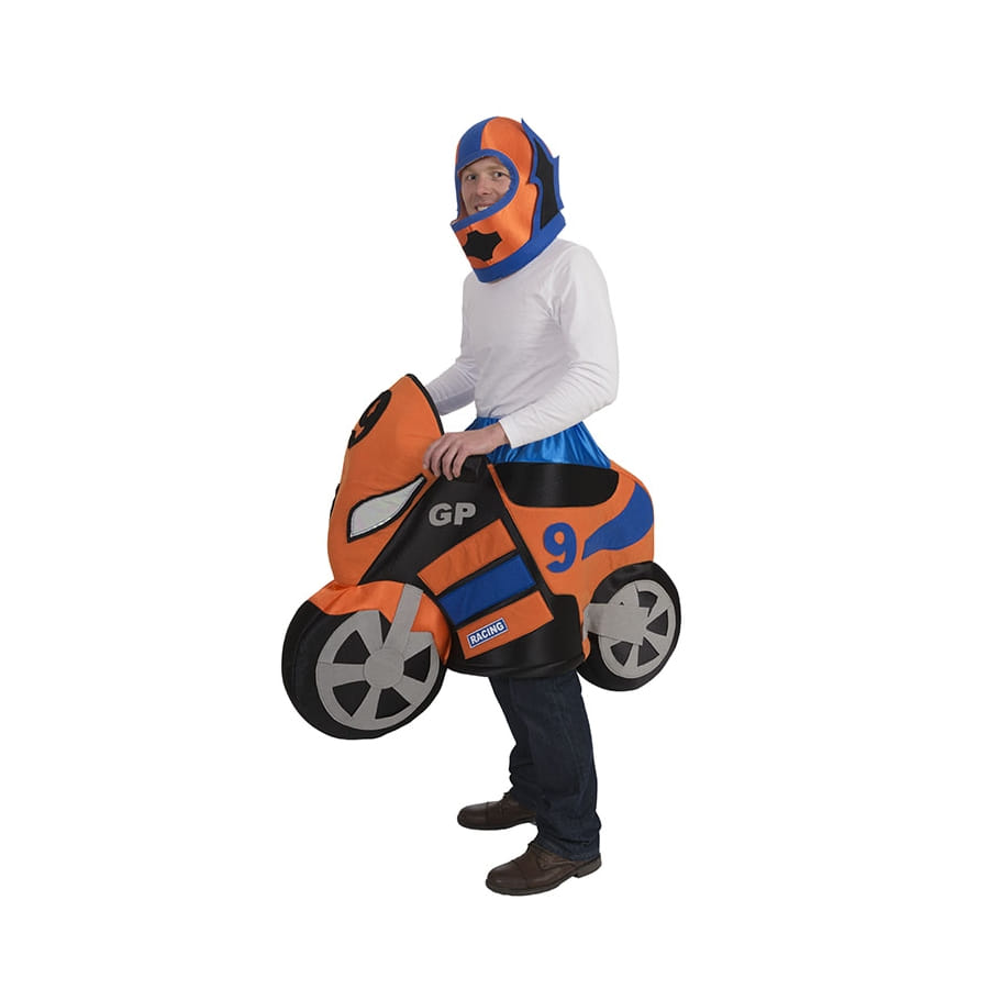 Ce costume se compose d'une moto orange faite en mousse, ayant le chiffre "9" imprimé en bleu sur la partie avant.