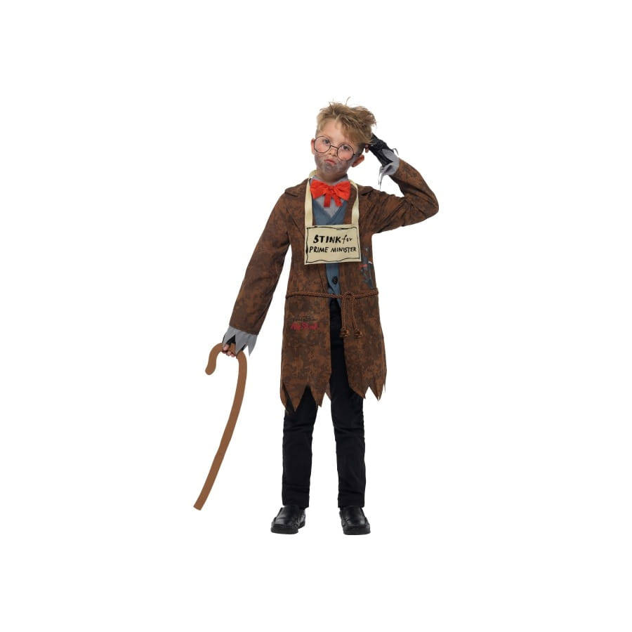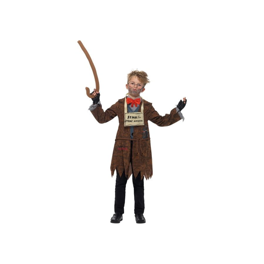 Mr Stink sent mauvais mais Chloé l'aime bien. Elle se lie d'amitié avec le clochard et décide de l'installer dans l'abri de jardin. Cette drôle d'histoire vous emporte dans une aventure touchante à travers le fabuleux costume de Mr Stink, David Walliams. La gent masculine de 4 à 15 ans pourra bénéficier de ce déguisement. Pour commencer, votre petit garçon enfilera une chemise grise sur laquelle sera fixé le noeud papillon rouge. Un faux gilet gris est aussi fourni ainsi qu'une longue veste marron à aspect un peu sale et aux bords en zig zag. Le costume inclut aussi des accessoires comme une paire de gants noirs laissant les doigts à découvert, une crosse marron et une paire de lunettes à monture ronde. Pour finir, l'écriteau avec inscription "Stink for Prime Minister" est à placer autour du cou.