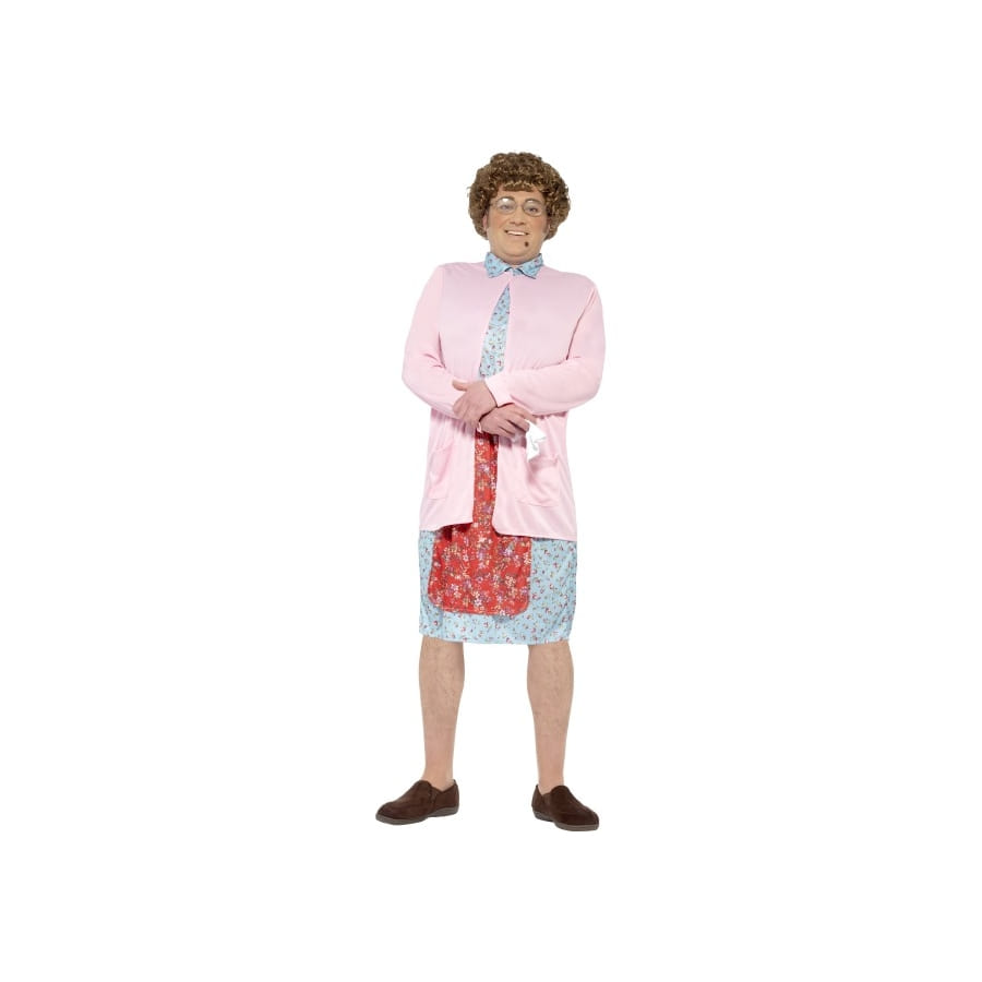 Ce costume de Mrs Brown se compose d'une robe rembourrée rouge et bleu, d'une veste de tricot rose. Ce déguisement s'inspire de la série télévisée américaine de Brendan O'Carroll, intitulée "Mrs Brown's Boys". Destiné aux hommes, ce costume de femme de ménage est proposé en taille M et saura apporter une bonne touche d'humour à votre fête. N'oubliez pas d'accessoiriser ce costume avec une perruque de grand mère, une bonne couche de rouge à lèvre, une paire de lunettes ainsi que des bas collants opaques.