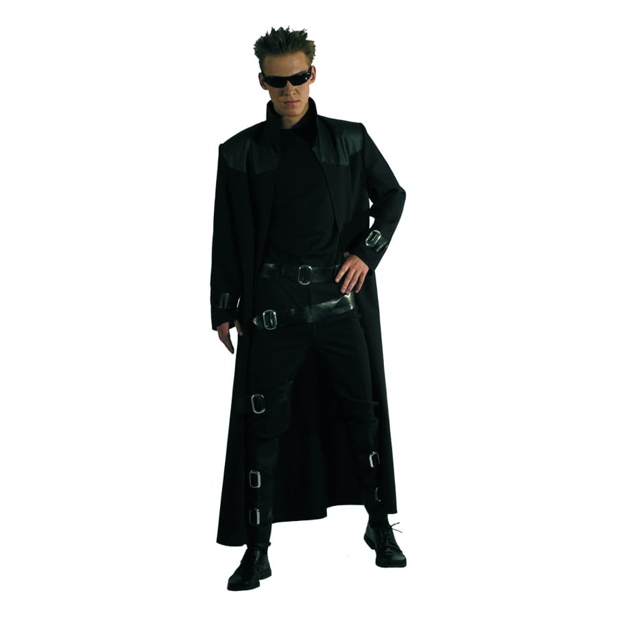 Les fans de Matrix seront aux anges avec ce costume, vous vous glisserez dans la peau du personnage principal du film Matrix dans cet ensemble. De très bonne qualité, ce déguisement est composé d'un pantalon avec des sangles, un tee shirt, un long manteau avec col avec effet cuir, des surbottes en plastique effet cuir avec scratch pour fixation. Le déguisement est disponible en deux tailles:50/52 et 54/56.