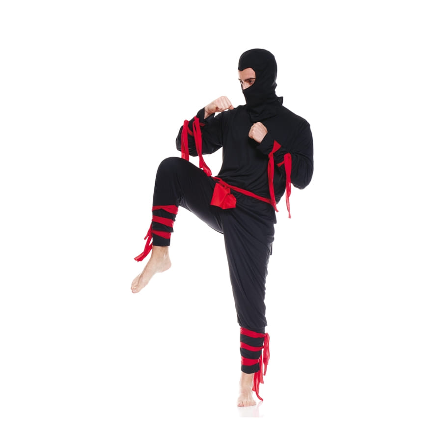 Pour entrer dans le cercle des ninjas, vous n'avez pas forcément besoin de maîtriser une discipline de combat. Vous pouvez tout simplement vous approprier le style vestimentaire ! Ce sera un jeu d'enfant avec ce costume de ninja noir pour adulte. Vous serez habillé d'un haut noir à manches longues et d'un pantalon noir vous permettant d'effectuer des mouvements amples. L'extrémité des manches ainsi que le bas du pantalon est agrémentée de rubans rouges. Une ceinture rouge est fournie pour mieux serrer au niveau de la taille. Et pour finir, la cagoule noire va recouvrir entièrement votre tête. Seuls vos yeux et une partie de votre front resteront à découvert, et vous pourrez ainsi garder l'anonymat lors d'une soirée déguisée.
