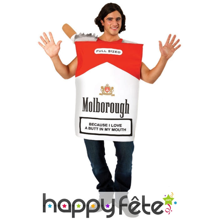 Le déguisement représente un paquet de cigarette de couleur blanche et rouge sur lequel sont inscrits les mots "FULL SIZED", "Molborough".