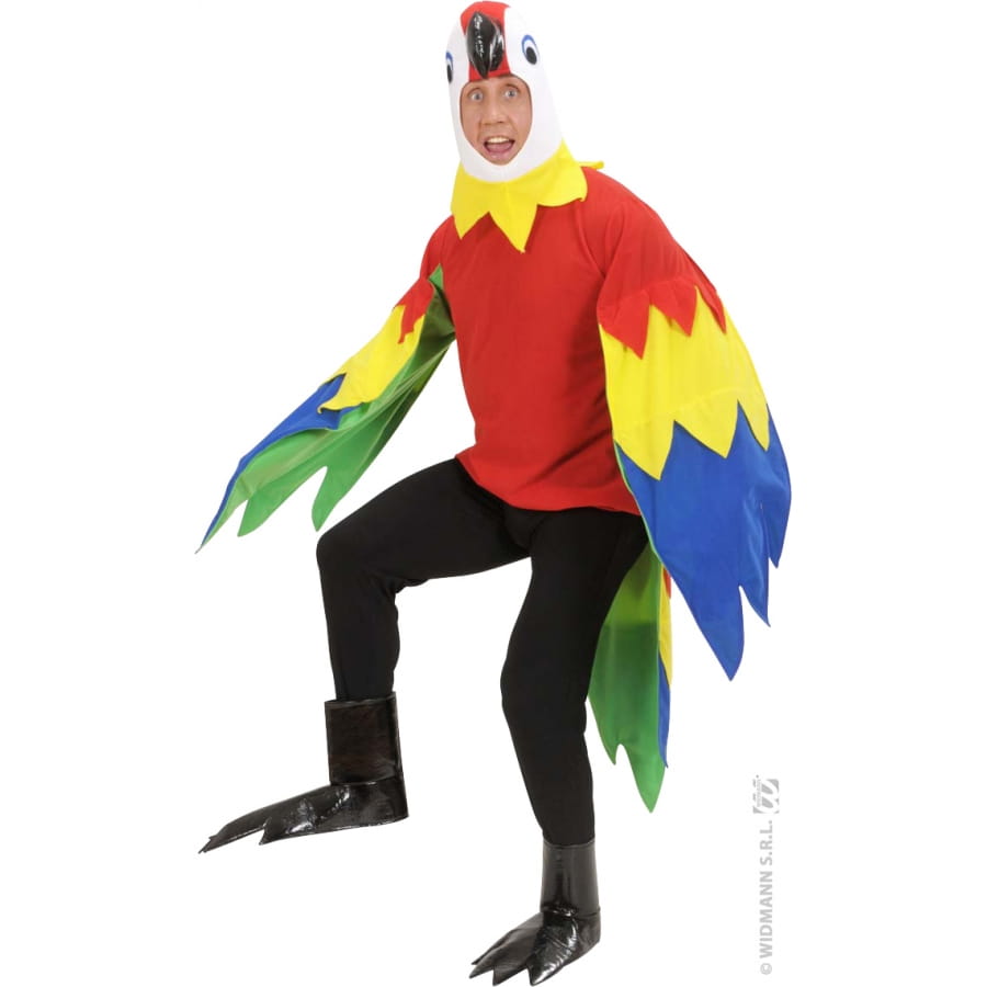 Set de déguisement d'animal, pour homme ou femme, composé d'une tunique avec queue intégrée, d'une paire d'ailes, de pieds et d'un masque. Cet ensemble blanc, bleu, jaune, noir, rouge et vert est parfait pour se déguiser en perroquet pour un carnaval.