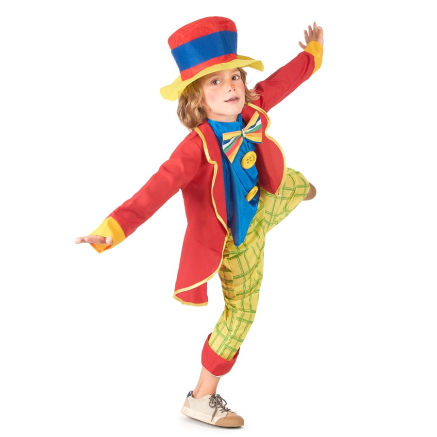Ce costume de petit clown rouge et jaune est constitué d'une veste rouge trois quart dont le bas du dos évoque une coupe en queue de pie. La veste est décorée d'un liseré jaune, les manches se terminent par une bande jaune au niveau des poignets. Un plastron satiné bleu est fixé sur le cou par des scratchs, décoré de deux gros boutons jaunes et d'un noeud papillon multicolore, ce qui donne un effet chemise. Un pantalon jaune à gros carreaux verts avec des bords rouges et maintenu par un élastique à la taille. Un chapeau rouge en feutrine à bord jaune, muni d'un ruban bleu, est assorti à la tenue. N'oubliez pas de retrouver sur notre site la perruque et le fameux nez rouge qui vont parfaire le déguisement !