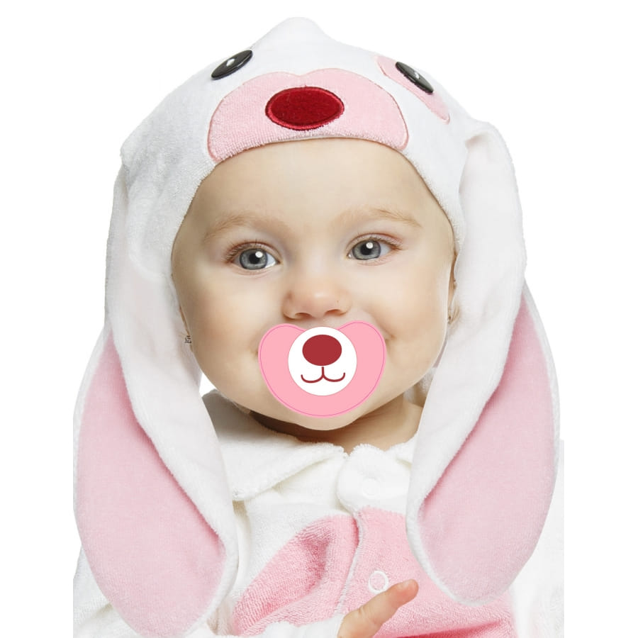 Pour la tétine, elle est blanche avec les motifs de nez et de bouche d'un lapin rose.