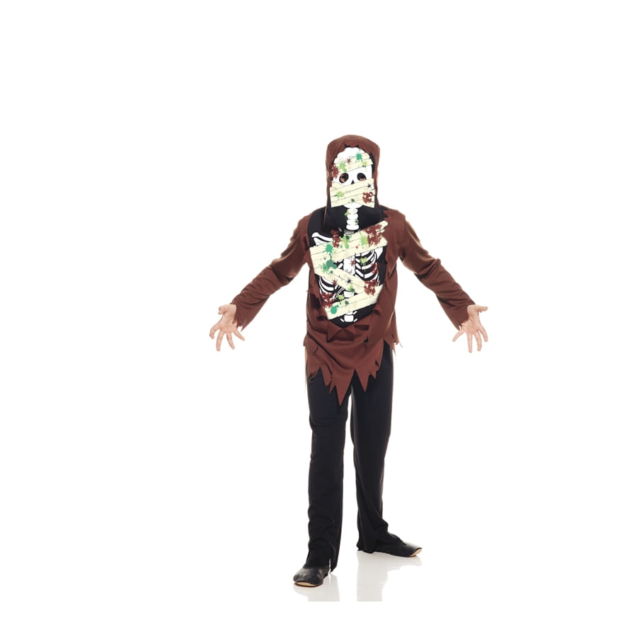 Halloween, c'est bien la fête des morts vivants non ? Les enfants pourront aussi jouer le jeu en cette occasion grâce à ce déguisement de petit squelette zombie. Deux personnages réunis dans un seul costume pour semer la panique. Il comprend un pantalon noir, accompagné d'une tunique marron qui arbore une affreuse découpe irrégulière. Pour un effet plus zombifiant, il est agrémenté d'un large masque avec une tête de squelette imprimée sur le devant. En guise d'effets spéciaux, cet accessoire est doté de tâche rougeâtre et verdâtre éparpillés jusqu'au niveau de la poitrine. Quant à la capuche, elle est de la même couleur que la tunique. La tenue est tellement originale que votre môme sera méconnaissable à l'intérieur.