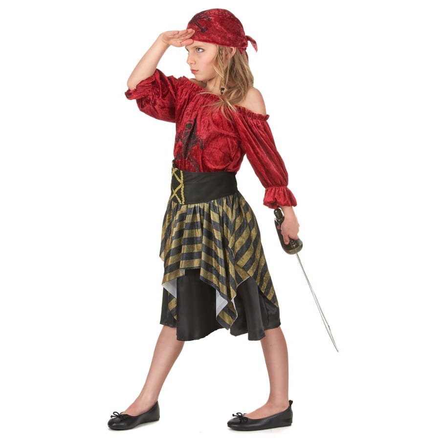 Prévoyez un déguisement hors pair pour votre petite fille. Pour ce faire, transformez-là en un vrai petit pirate. Aussi, nous vous proposons le costume de petite corsaire rouge effet velours, qui reste disponible sur notre site. Très stylé, il renferme une jupe noire très évasée, pourvue d'une sur-jupe portant des rayures bleu marine et dorées. Le haut, taillé dans un tissu imitation velours rouge, donne de la classe à la tenue. A épaules dénudées, il présente une tête de mort noire sur l'avant. Le bandana, assorti à ce haut, affiche également le même motif. Une ceinture noire et dorée accompagne l'ensemble et marque la taille.