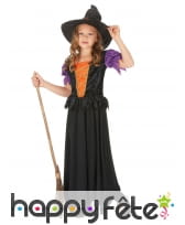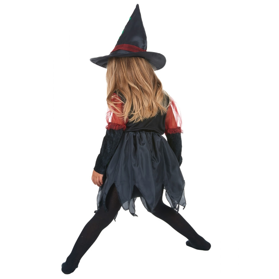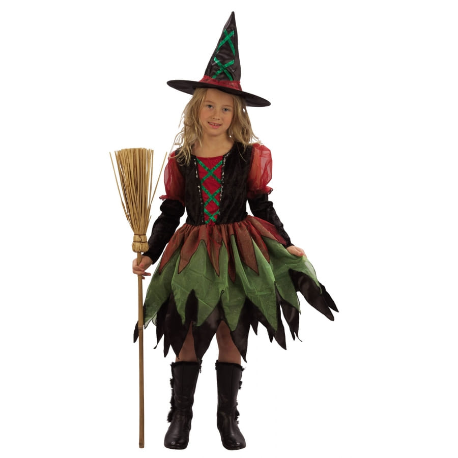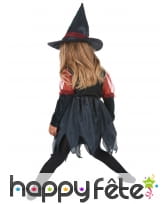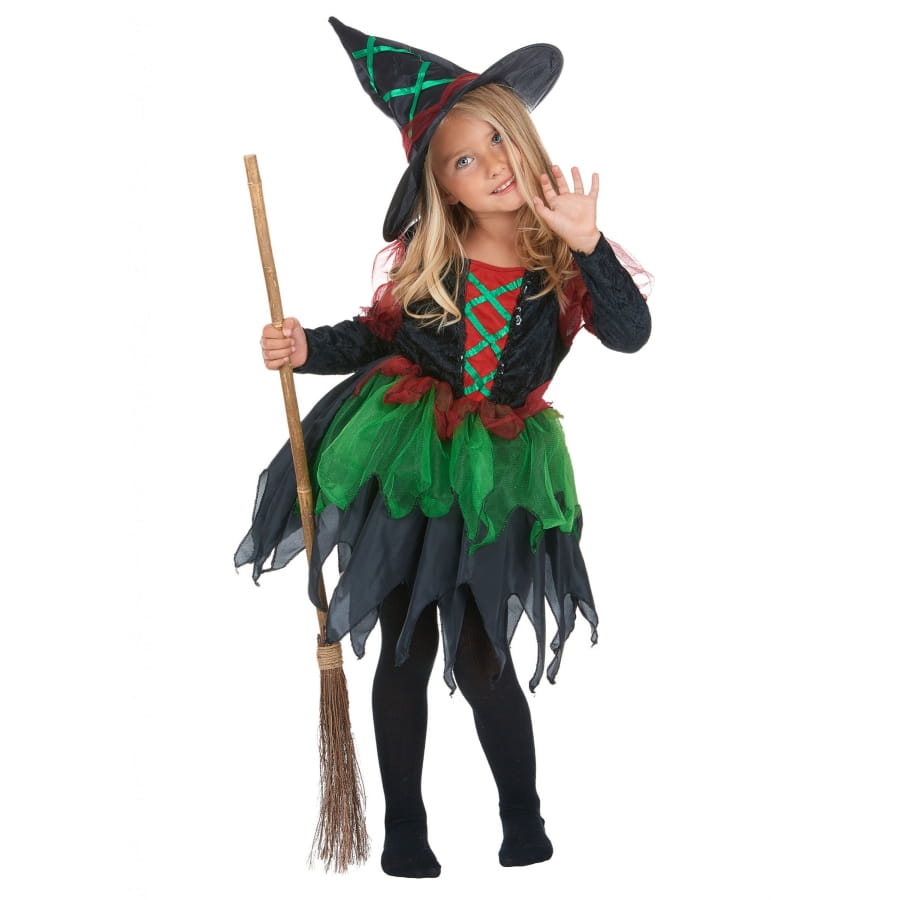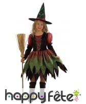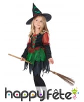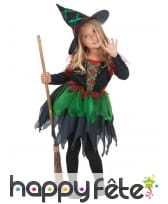 Votre fille sera une coquette sorcière le temps d'halloween si elle enfile le costume de petite sorcière verte avec tulle. Cet article reste disponible sur notre site. Il contient une petite robe verte et rouge. Le haut de la robe possède des manches longues et il se compose de tissu à l'aspect de velours. Au niveau du buste, un faux corsage orne la robe pour un effet très classe. La partie jupe de la robe est faite d'une superposition de voile et du même tissu noir à l'aspect velours. Les couleurs rouge, noir et verte se retrouvent sur cette jupe. Un chapeau de sorcière complète ce déguisement. De couleur noire, un ruban vert et un voile rouge le décorent.