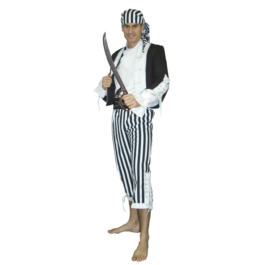 Ce costume de pirate ira parfaitement si vous organisez une soirée déguisée ou vous pouvez aussi le mettre pour le carnaval. Ce costume en noir et blanc est disponible en 50/52 et 54/56. Il est composé d'un foulard noir et blanc, d'une veste noir et blanche avec des lacets sur la manche, d'une ceinture noir, ainsi que d'un pantalon avec des lacets sur le coté.