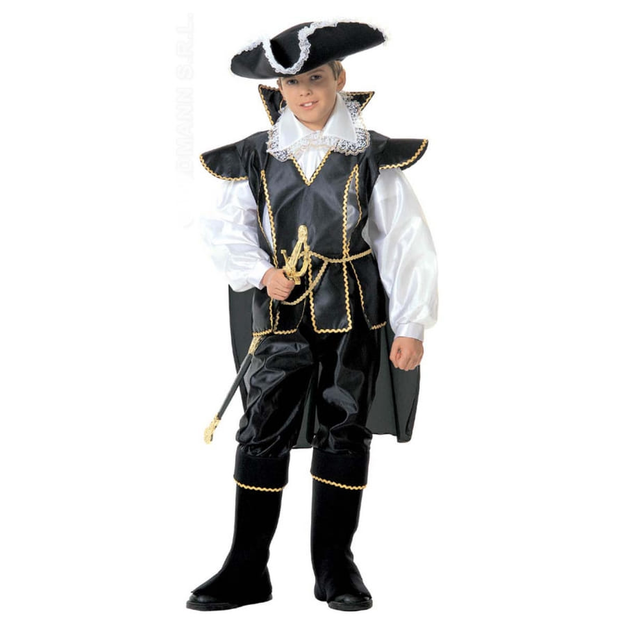 Pour que votre jeune garçon ait l'air d'un vrai capitaine de navire, nous vous conseillons ce costume de pirate noir et dentelles, enfant. Il s'agit ici d'un ensemble de quatre pièces dont une chemise blanche satinée à col large ornée de dentelle avec de longues manches resserrées sur les poignets. Vous avez également un pantalon satiné noir assez large, un pardessus noir sans manche avec col relevé et épaulettes à bordure dorée, avec une cape légère fixée à l'arrière. Et pour compléter la tenue : un chapeau de pirate de couleur noire, orné de dentelle blanche. Ce costume est idéal pour les fêtes costumées ou les fêtes à thème, à l'abordage !