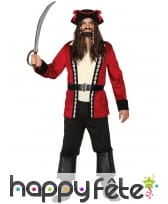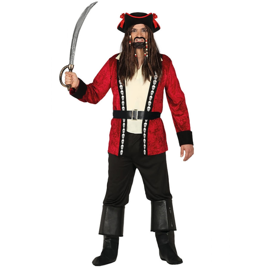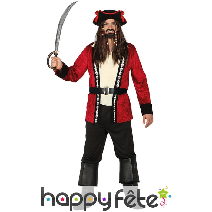 Le costume de pirate rouge et noir avec crânes pour homme est un ensemble de 3 pièces.
