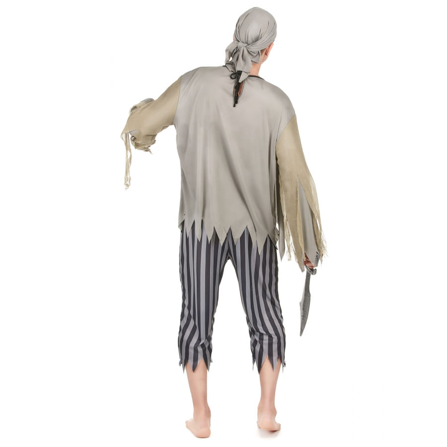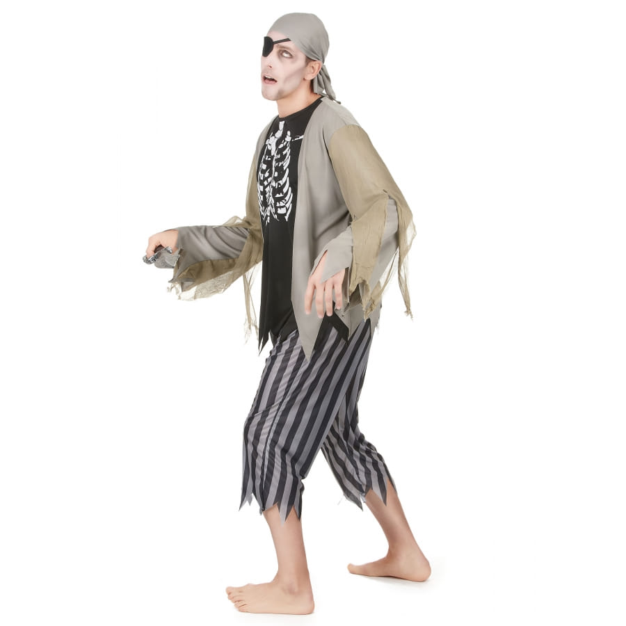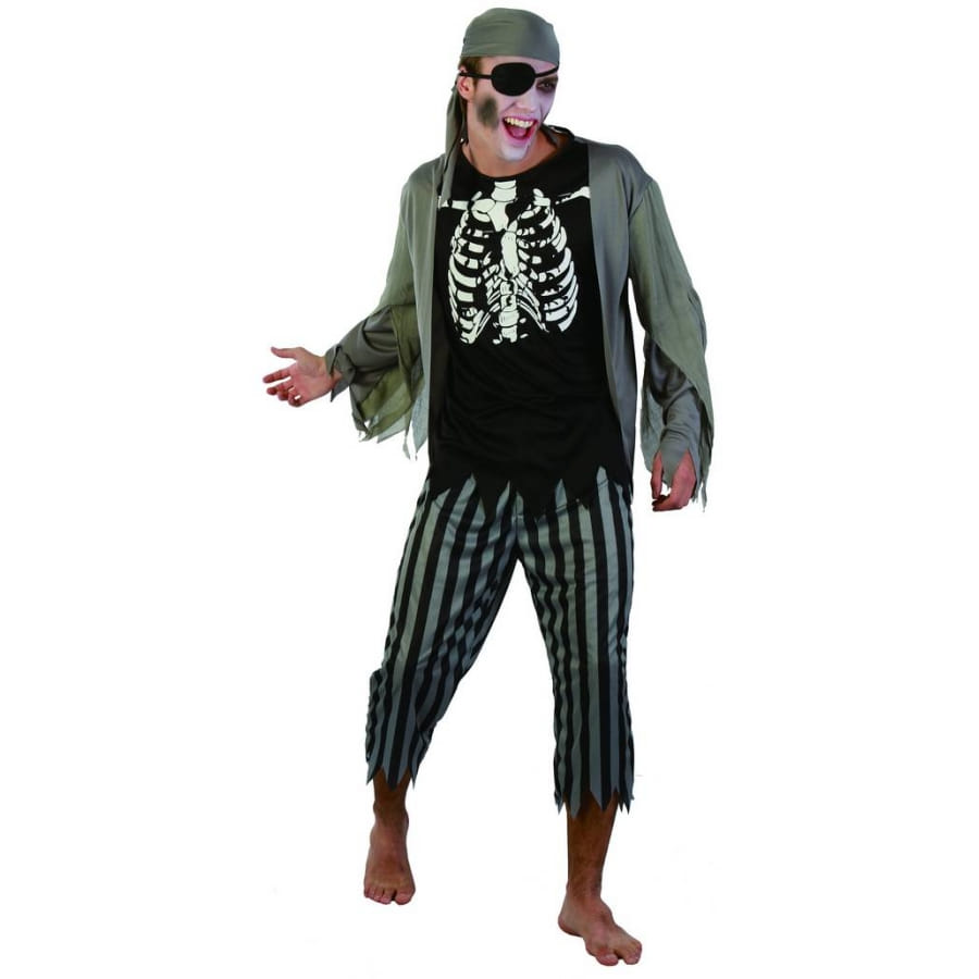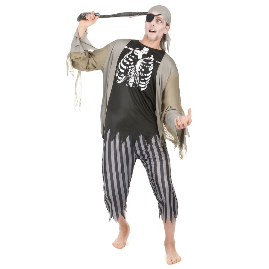 Incarnez le pirate maudit des mers grâce à Costume de pirate squelette zombie composé d'un t-shirt, d'un pantacourt, d'un bandeau et d'un cache-oeil.