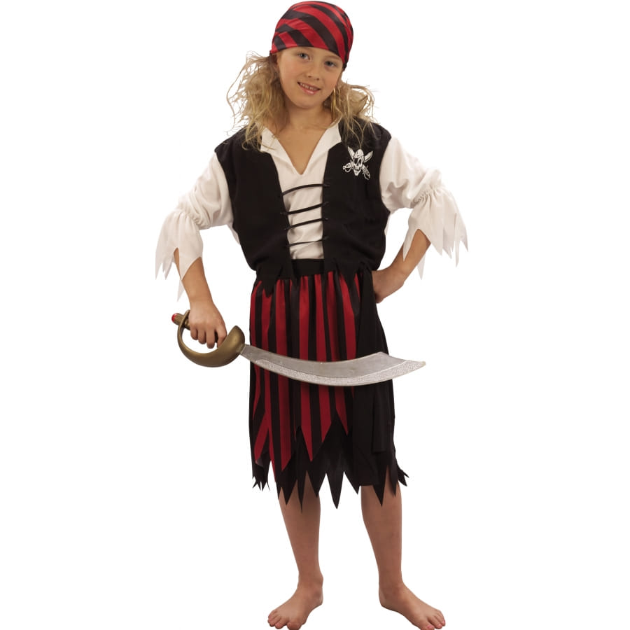 Les pirates font la loi sur les mers. Les petites filles aussi vont pouvoir devenir des héroïnes grâce au costume de piratesse ligné rouge et noir, enfant. Ce déguisement est constitué par une chemise ample, de couleur blanche, avec des manches trois quart. Ses bords ont un aspect dentelé. Un gilet noir à col fendu, avec motif insigne de pirate y a été cousu. Une jupe à rayures rouges et noires complète la tenue. Ses bords sont également dentelés, et elle descend jusqu'à la hauteur des genoux. La ceinture est noire et le bandana est de couleur assortie à la jupe. L'article est disponible sous différentes tailles, pour les enfants de 4 à 12 ans.