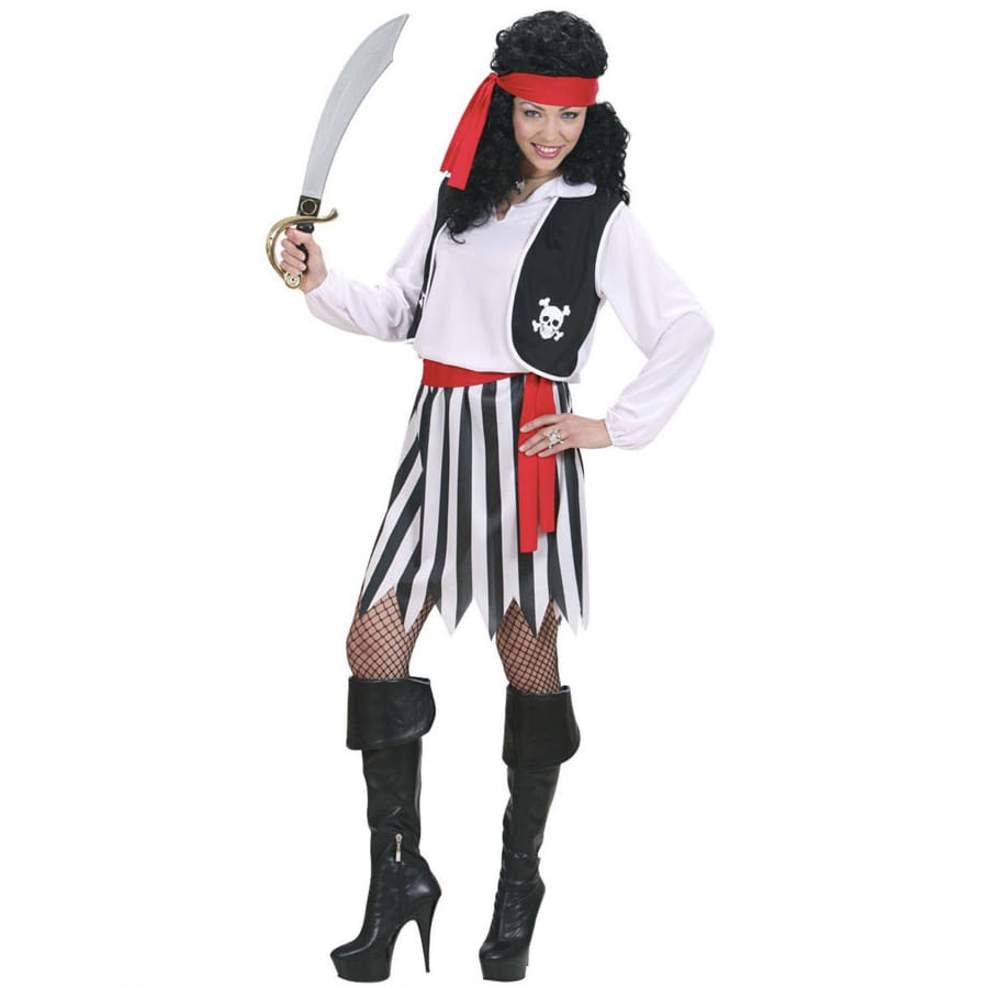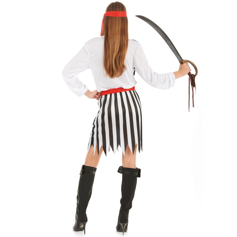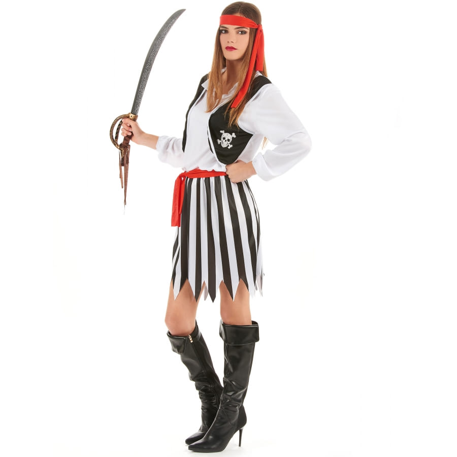 Pourquoi ne pas opter pour un costume de piratesse robe rayée noire et blanche pour la fête des morts ? Un tel déguisement fait partie des incontournables d'halloween ! Il contient une jupe à rayures verticales noires et blanches maintenue par une ceinture rouge. Les bordures de la jupe présentent des découpes en dents de scie pour un effet déchiqueté. Le haut est un chemisier blanc à manches longues et bouffantes. Conçu dans une matière souple et légère, il offre un confort au port. Un gilet noir avec une tête de mort de chaque côté se met sur ce chemisier. Pour compléter l'ensemble, un bandeau rouge se noue à la tête pour un vrai look de pirate !