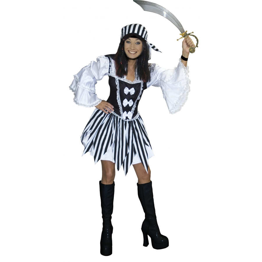A l'abordage ces ce que vous allez dire en revetant ce costume de piratine Larissa, un costume très sexy, la robe a des manches langues, quelques noeud blanc sur le devant de la robe et elle est courte. Le costume est aussi composé d'un foulard. Disponible en taille: 38/40 et 42/44, cet ensemble ira très bien si vous incarnez le personnage d'un pirate.