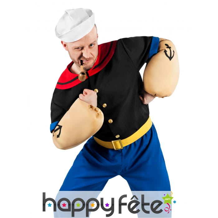 Les faux bras sont rembourrés pour rappeler les bras musclés de Popeye. De couleur chair, ils sont tatoués d'une ancre pour s'inscrire dans le look du marin chevronné.