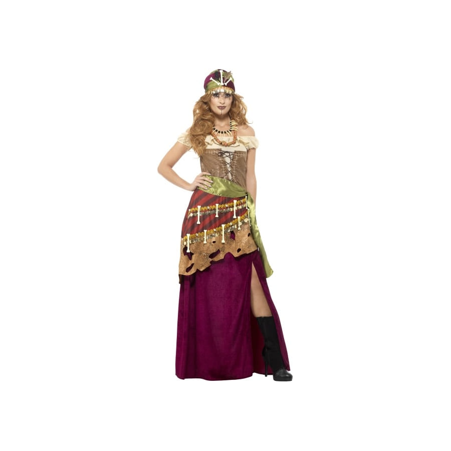 Jouez avec les couleurs pour votre prochain déguisement d'halloween en orientant votre choix sur le costume de prêtresse vaudou luxe. Cet article est composé de plusieurs éléments comme la robe multicolore fendue à partir du haut du genou gauche. En guise de décoration, elle a des osselets accrochés sur le devant et aussi un lambeau de faux cuir. Vous aurez droit à un foulard vert effet satiné à attacher sur la taille. Un chapeau multicolore avec des osselets est également fourni avec ce produit. Le costume de prêtresse vaudou luxe comprend aussi deux colliers dont l'un est fait de faux crocs et l’autre de perles marrons.