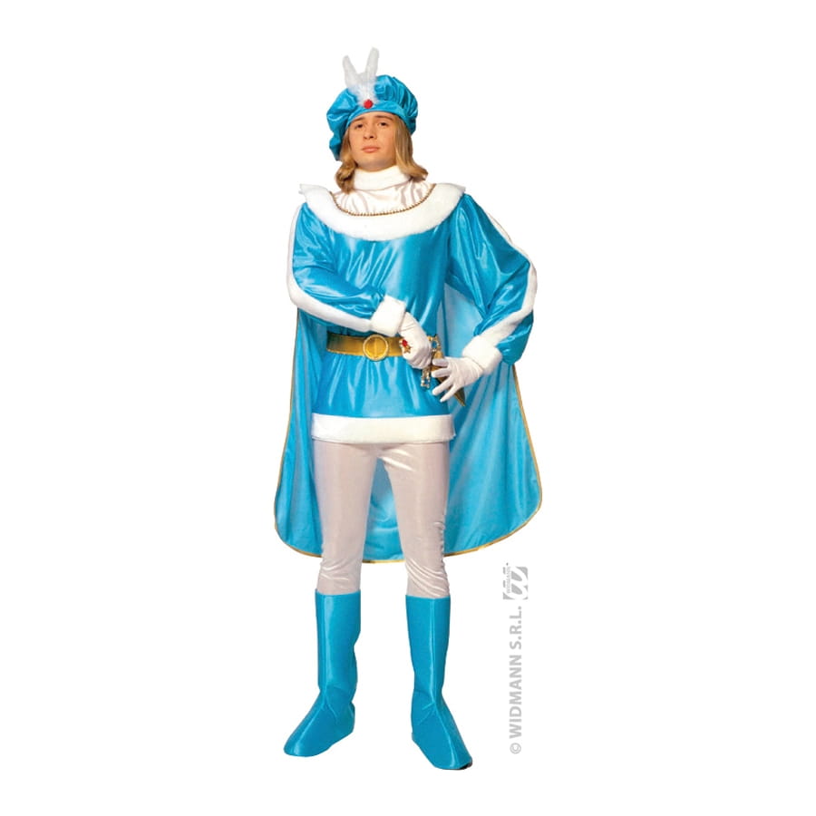 On vous croira tout droit sorti d'un conte de fée avec ce pantalon, la tunique, la cape, la ceinture, les surbottes et la coiffe. Cet ensemble blanc, bleu et doré est disponible en taille L, M ou XL. Il est parfait pour se déguiser en prince bleu.