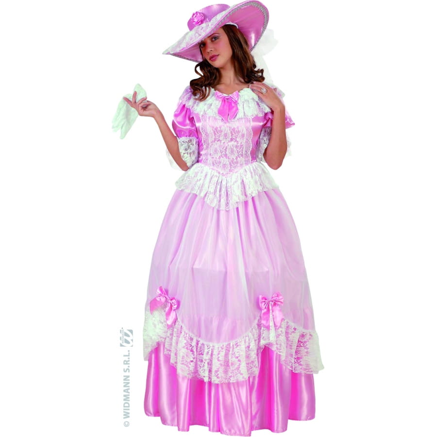 Vous serez comme dans un véritable compte de fée dans ce déguisement de princesse. Ce costume de qualité supérieure comporte une longue robe avec cerceau avec de la dentelle sur la robe et des rubans. La robe est rose et blanc, le costume est aussi composé d'un chapeau rose avec une petite fleur sur le dessus.