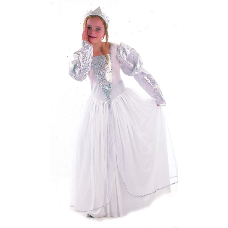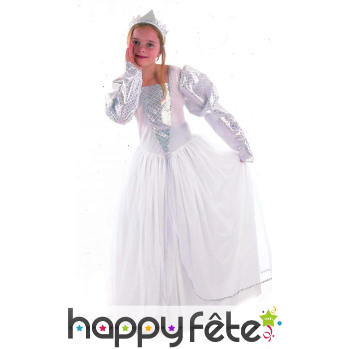 Les jeunes demoiselles ne se lassent jamais des histoires de princesses ! Les contes de fées viennent parfois épouser notre réalité, comme lorsqu'on s'en inspire pour se déguiser. Ainsi, votre petite fille pourra créer sa propre histoire en s'aidant de ce costume de princesse blanche et argent pour enfant. Il est formé par une longue et magnifique robe blanche recouverte de voilages transparents. Ses manches sont longues et bouffantes. Le devant de la robe et les manches sont parsemés de petits motifs argentés. Le déguisement est bien évidemment complété par une couronne de princesse, à aspect brillant et argenté. Le déguisement est adapté aux enfants de 4 à 12 ans, avec différentes tailles disponibles.