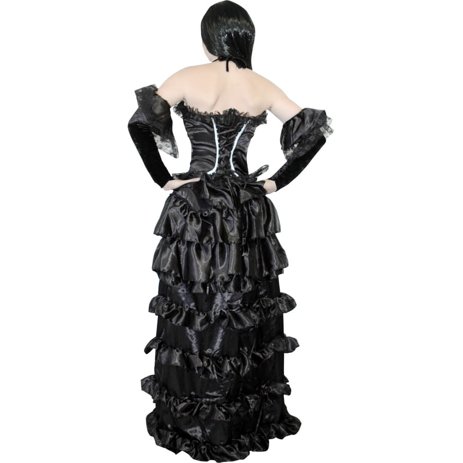 Set gothique, pour femme ou adolescente, composé d'une robe longue à l'arrière et courte à l'avant, de manches, de mitaines et d'un tour de cou. Cet ensemble noir est disponible en taille 36, 38/40 ou 42/44. Il est parfait pour se déguiser en sorcière ou en princesse gothique.