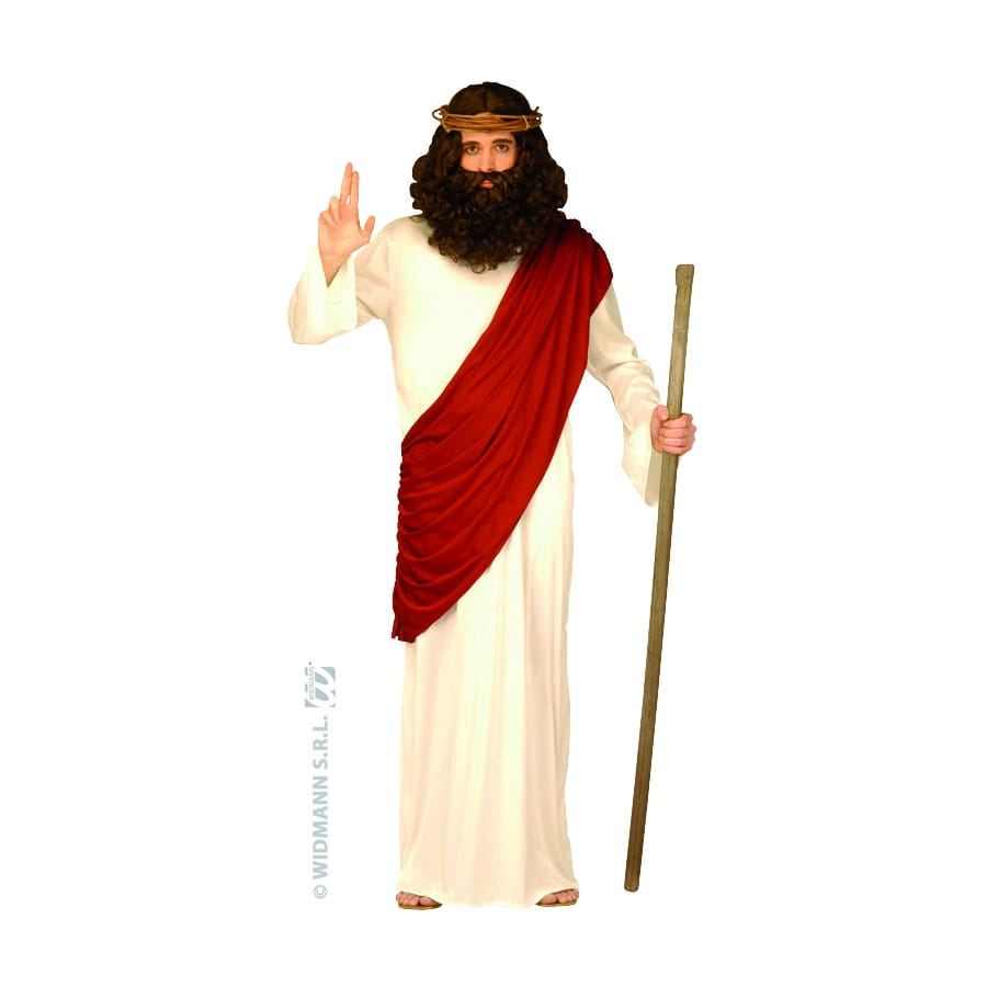 Prêchez la bonne nouvelle avec ce déguisement composé d'une toge rouge, d'une tunique blanche et d'une couronne d'épines marron. Cet ensemble est disponible en taille S, M ou L. Il est parfait pour se déguiser en prophète ou en Jésus lui-même.