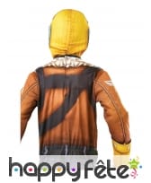 La cagoule jaune assortie à la combinaison est imprimée d'un micro-casque, un équipement que porte le célèbre personnage en permanence.