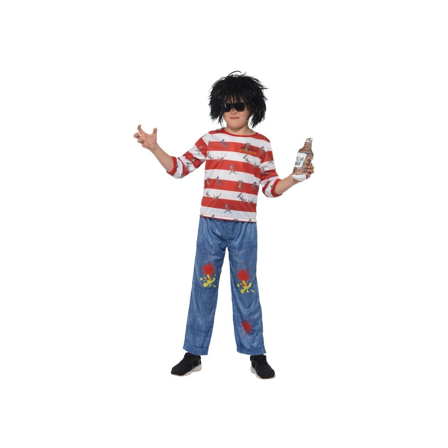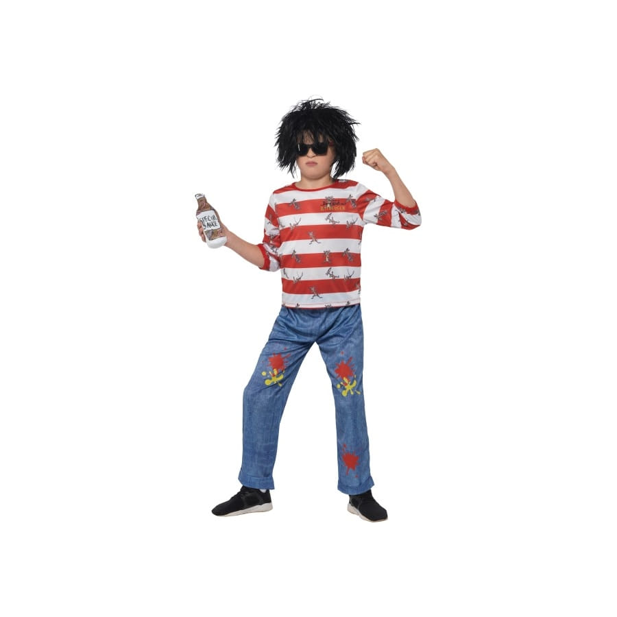 La petite Zoé est très attachée à Armitage, son bébé rat, alors que l'ignoble Burt veut le transformer en hamburger ! Retrouvez cette aventure hilarante à travers le célèbre roman Ratburger. Les petits garçons sont invités à incarner le rôle du méchant dans ce costume de Ratburger, David Walliams. Pour ressembler à Burt, il suffira d'enfiler l'ensemble haut et pantalon fournis par ce déguisement. Le haut est à rayures rouges et blanches, tandis que le pantalon est bleu agrémenté de taches rouges et jaunes. Pour la coiffure, vous aurez droit à une perruque noire à franges. La paire de lunettes noires donne des airs de bad boy. Une fausse bouteille de sauce spéciale avec puce sonore intégrée complète l'ensemble. A noter que le costume est fourni en différentes tailles, pour les 4 à 15 ans.