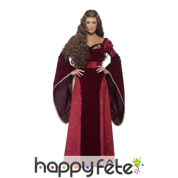 Soyez la plus belle de la fête en portant ce costume de reine médiévale rouge. Il comprend une robe très longue aux manches cloches, tout comme un costume royal, une ceinture et une pièce de tête dorée. Il est de couleur bordeaux, disponible en taille S, taille M, taille L et taille XL. Cette tenue a été conçue, Mesdames, pour que vous le portiez à l'occasion de fêtes costumées à thème médiéval ou historique. Vous serez une charmante et impérieuse reine et votre roi sera l'homme le plus chanceux de la fête.