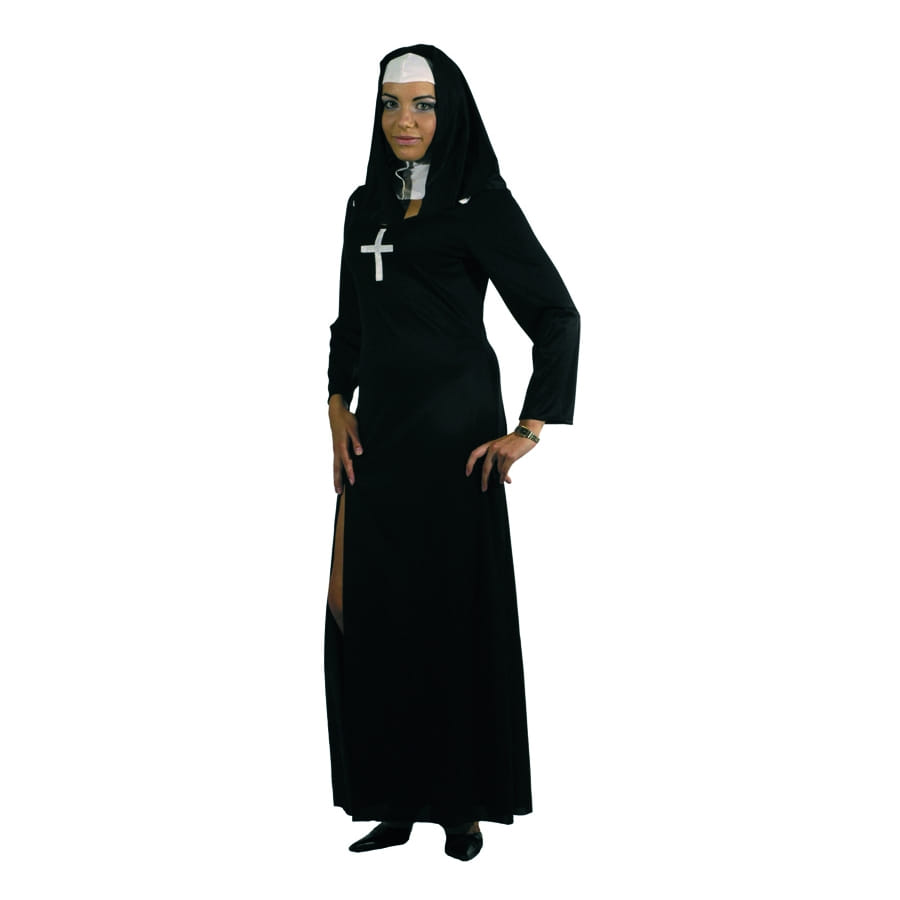 Costume de religieuse pour femme composé d'une robe noire et d'une coiffe noir et blanc. Cet ensemble est disponible en taille 38-40 ou 42-44. Déguisez-vous en bonne soeur pour un carnaval!