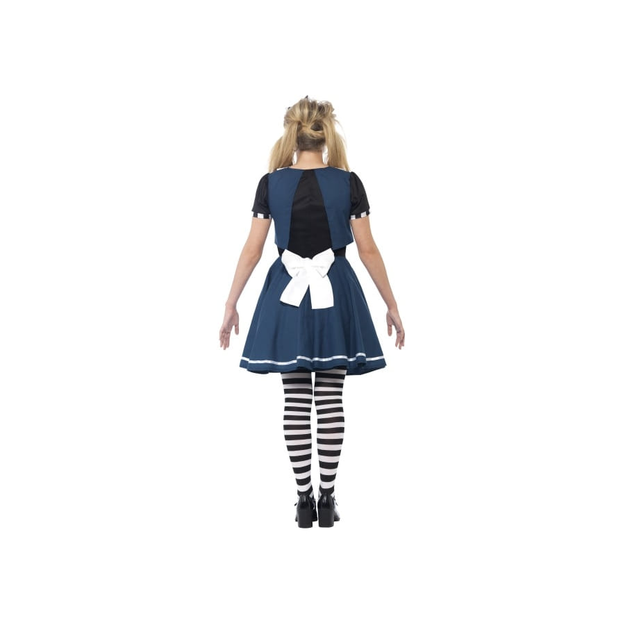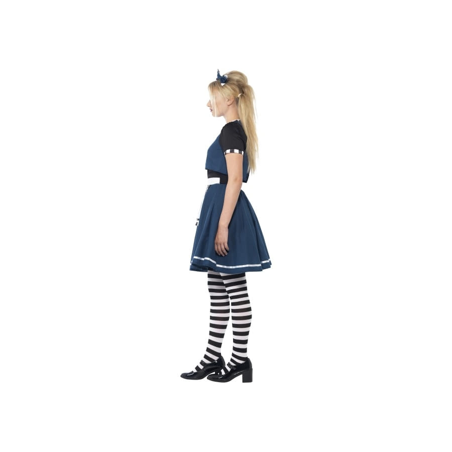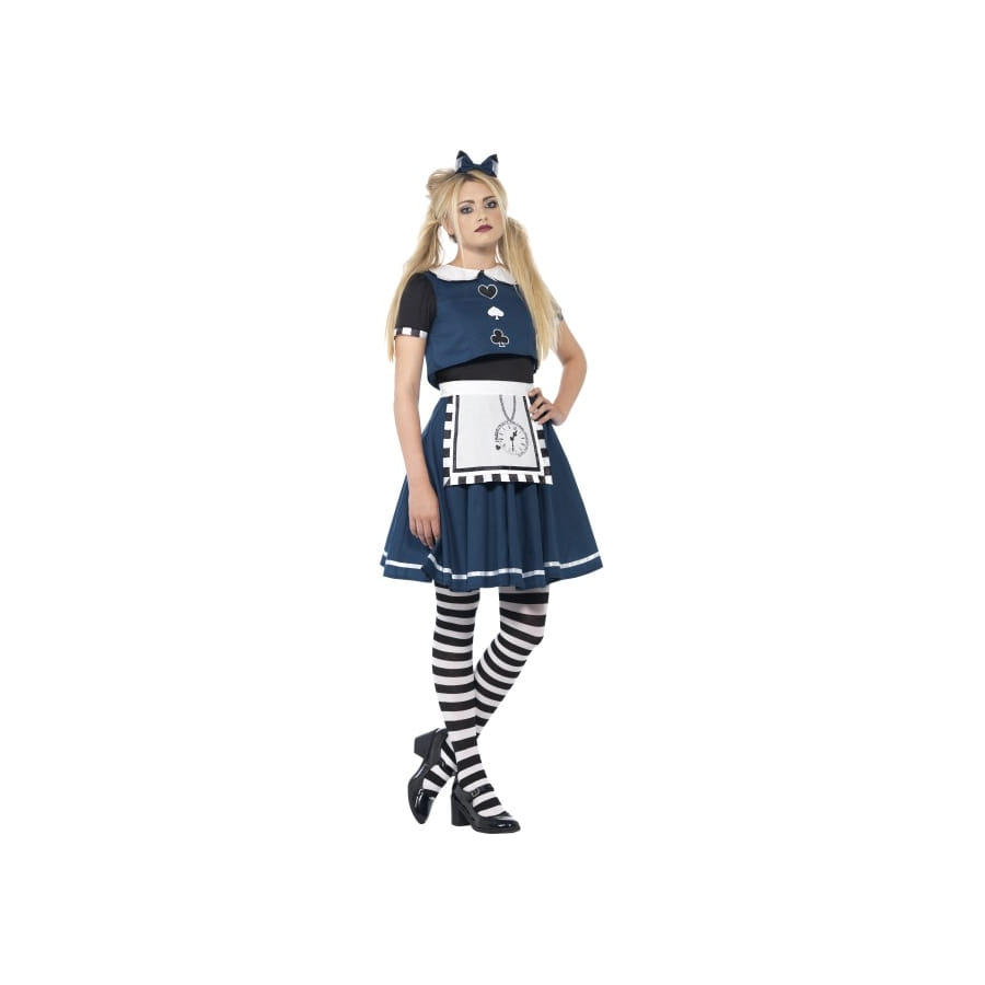 Nous vous proposons ici un costume de rêveuse intemporelle, destiné aux jeunes filles, à porter pour une fête à thème "conte de fée". Il comprend une robe à volants, à manches courtes, de couleur bleue, avec un col claudine pour le haut, et des ornements de coeur, pique et trèfle, et pour la jupe du bas, une grande poche blanche sur le devant, et également une jolie coiffe bleue en forme de noeud. Les tailles disponibles pour ce produit sont : 15/16 ans, 17/18 ans. Profitez de votre jeunesse ! Amusez-vous bien en vous plongeant dans le monde d'une rêveuse intemporelle !